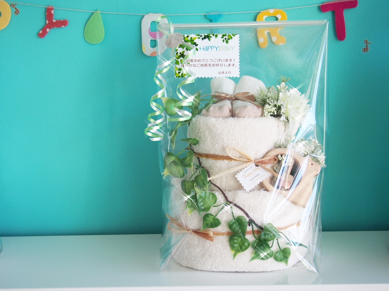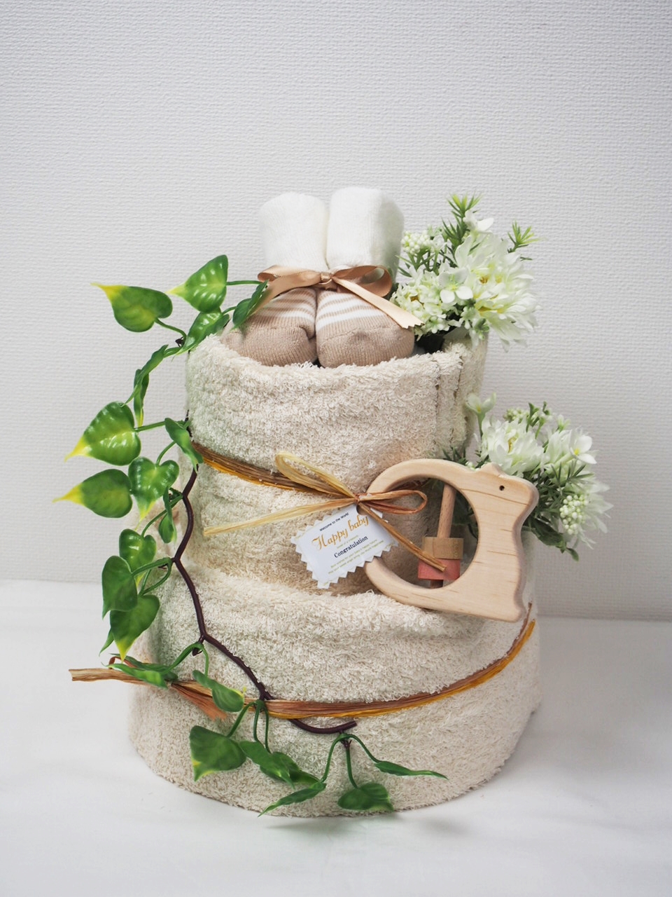 ・パンパースおむつ ・今治オーガニック フェイスタオル&ウォッシュタオル ・日本製ウッド動物ラトル ・ベビーソックス ・サテンリボン ・カード ・アートフラワー ・ケーキトレー