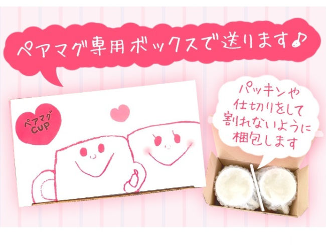 ペアマグのキュートなデザインが施された専用オリジナルボックスに入れてお届けします。中には仕切りを入れて、割れないように丁寧に梱包します。
