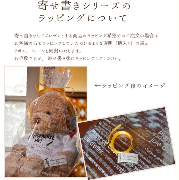 寄せ書きを書いた後にプレゼントすることができるように、ぬいぐるみがすっぽり入るビニール袋、リボン、シールをお付けします。