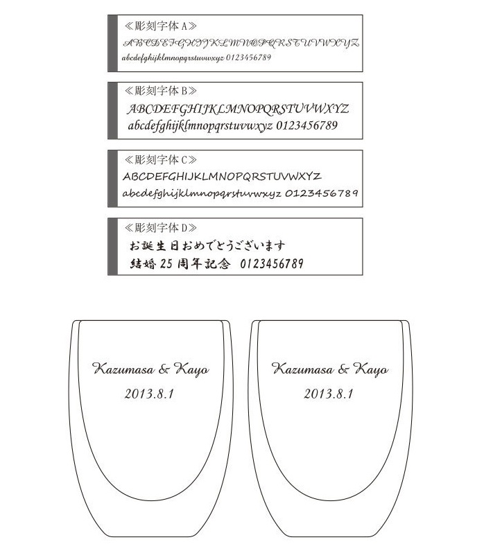 | 対応可能オプション | 【無料オプション】 ●包装紙での包装 ・アンティーク包装 ・赤包装紙 ・白包装紙 ●のし ・結び切り【御祝】 ・結び切り【御祝】+注文者名 ・蝶結び【御祝】 ・蝶結び【御祝】+注文者名 ・結び切り【御結婚祝い】 ・結び切り【御結婚祝い】+注文者名 ・蝶結び【御出産祝い】 ・蝶結び【御出産祝い】+注文者名 ・結び切り【内祝】 ・蝶結び【内祝】 ・その他 ●メッセージカード(A・B・Cの3種類デザインより選択。文字は40文字位まで可能です。フォントや文字の大きさは文字数によりこちらで決めさせて頂きます。) ●1、【彫刻字体】をお選びください。 2、ご注文時にグラスへの【彫刻内容】をご記入ください。 ・英字体は1行15文字、日本字体は1行10文字で、それぞれ2行まで彫刻可能[スペース 記号など含む] ▽記入例 Naoya & Yukari 2013.11.14 |