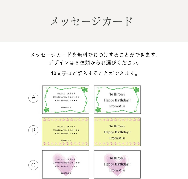 | 対応可能オプション | 【無料オプション】 ●包装紙での包装(ギフトボックスの種類やラッピング形状は選べません) ●熨斗 ・結び切り【御祝】 ・結び切り【御祝】+注文者名 ・蝶結び【御祝】 ・蝶結び【御祝】+注文者名 ・結び切り【御結婚祝い】 ・結び切り【御結婚祝い】+注文者名 ・蝶結び【御出産祝い】 ・蝶結び【御出産祝い】+注文者名 ・結び切り【内祝】 ・蝶結び【内祝】 ・その他 ●メッセージカード(A・B・Cの3種類デザインより選択。文字は40文字位まで可能です。フォントや文字の大きさは文字数によりこちらで決めさせて頂きます。) ●刻印について(無料刻印オプションと有料刻印オプションの2種類) プレートカラー:ゴールド・シルバー名入れの内容をご記載ください。 ▽記入例 メッセージOurluvwilllastforever 記念日2010.08.20 イニシャル女C男M ※ご注文時に【メッセージ】【日付】【男性と女性のイニシャル】をご記入ください。 プレート裏面にメッセージや記念日を彫ることも可能です。 (オプション料金\1,000(税別))ご希望のお客様は刻印内容をご記入ください。 |