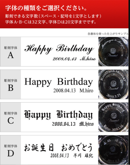 | 対応可能オプション | 【無料オプション】 ●熨斗 ・結び切り【御祝】 ・結び切り【御祝】+注文者名 ・蝶結び【御祝】 ・蝶結び【御祝】+注文者名 ・結び切り【御結婚祝い】 ・結び切り【御結婚祝い】+注文者名 ・蝶結び【御出産祝い】 ・蝶結び【御出産祝い】+注文者名 ・結び切り【内祝】 ・蝶結び【内祝】 ・その他 ●メッセージカード(A・B・Cの3種類デザインより選択。文字は40文字位まで可能です。フォントや文字の大きさは文字数によりこちらで決めさせて頂きます。) ●彫刻について ご注文時に【彫刻内容】をご記入ください。 記入例 Happy Birthday Masaki 2017.10.30 *彫刻可能文字数はアルファベット32文字、かな漢字16文字となります。 ■彫刻字体下記より選択 ・A ・B ・C ・D |