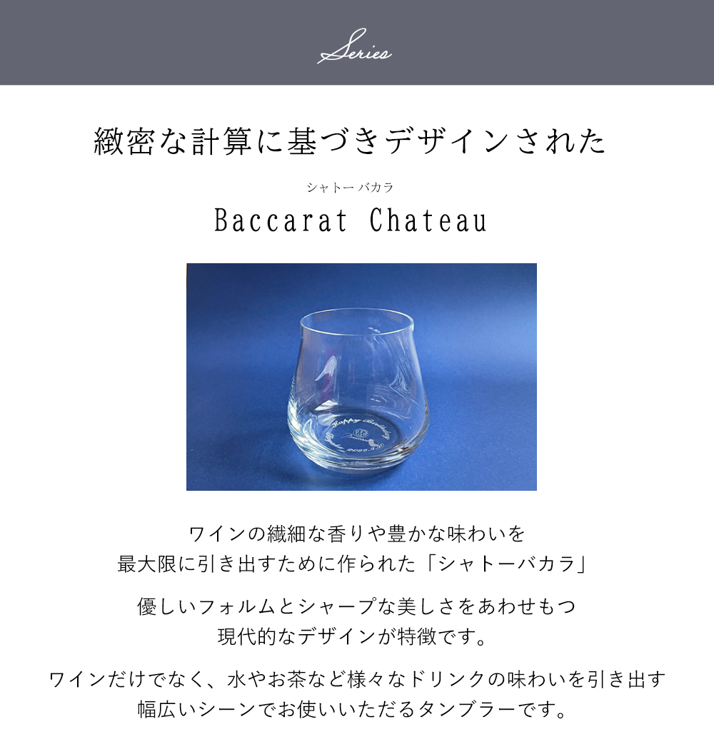 | パッケージ外装 | バカラ化粧箱 ※バカラシールについて 商品画像にも有るグラスに付いている四角い赤色のシールですがバカラ本体より2014年からシールを付けないで提供するとの事です。 従いまして、お客様の手元に届きましたグラスにはシールが付いていない場合がございますので予めご了承くださいませ。 |