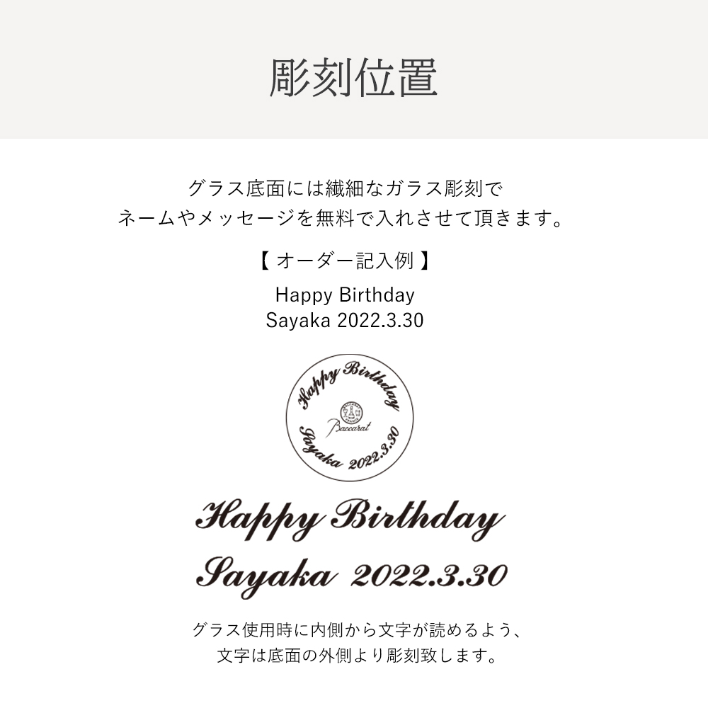 グラスの底面には繊細なガラス彫刻で名前やメッセージを入れることができます。文字彫刻は底面の外側から彫刻するので、グラスを使う度に内側から見えます。