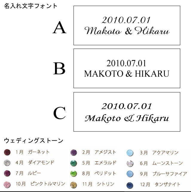 | 対応可能オプション | 【無料オプション】 ●包装紙での包装 ・アンティーク包装 ・赤包装紙 ・白包装紙 ●熨斗 ・結び切り【御祝】 ・結び切り【御祝】+注文者名 ・蝶結び【御祝】 ・蝶結び【御祝】+注文者名 ・結び切り【御結婚祝い】 ・結び切り【御結婚祝い】+注文者名 ・蝶結び【御出産祝い】 ・蝶結び【御出産祝い】+注文者名 ・結び切り【内祝】 ・蝶結び【内祝】 ・その他 ●メッセージカード(A・B・Cの3種類デザインより選択。文字は40文字位まで可能です。フォントや文字の大きさは文字数によりこちらで決めさせて頂きます。) ●彫刻について 1、【彫刻フォント】を選択してください。 2、ご注文時にプレートへの【彫刻内容】をご記入ください。 記入例 2011,05,22 Satoshi & Tomoko ■彫刻字体下記より選択 フォントA フォントB フォントC |