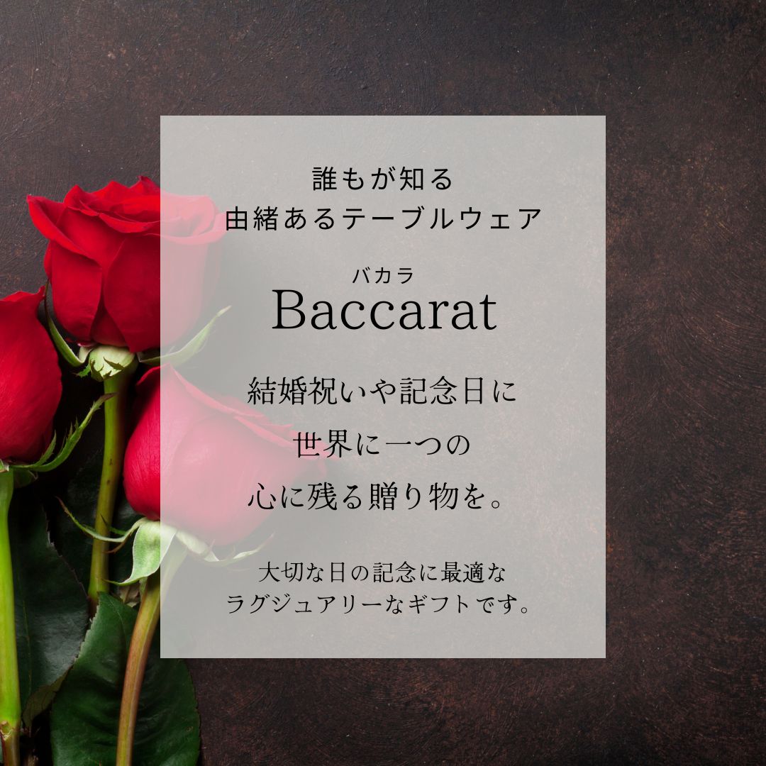 | パッケージ外装 | バカラ化粧箱 ※バカラシールについて 商品画像にも有るグラスに付いている四角い赤色のシールですがバカラ本体より2014年からシールを付けないで提供するとの事です。 従いまして、お客様の手元に届きましたグラスにはシールが付いていない場合がございますので予めご了承くださいませ。 |