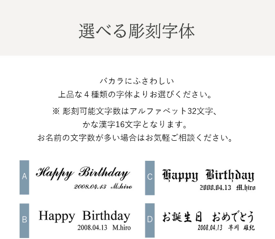 | 対応可能オプション | 【無料オプション】 ●熨斗 ・結び切り【御祝】 ・結び切り【御祝】+注文者名 ・蝶結び【御祝】 ・蝶結び【御祝】+注文者名 ・結び切り【御結婚祝い】 ・結び切り【御結婚祝い】+注文者名 ・蝶結び【御出産祝い】 ・蝶結び【御出産祝い】+注文者名 ・結び切り【内祝】 ・蝶結び【内祝】 ・その他 ●メッセージカード(A・B・Cの3種類デザインより選択。文字は40文字位まで可能です。フォントや文字の大きさは文字数によりこちらで決めさせて頂きます。) ●彫刻について ご注文時に【彫刻内容】をご記入ください。 記入例 グラス1 Happy Wedding Masaki & Riko グラス2 Since 2025.10.30 *彫刻可能文字数はアルファベット32文字、かな漢字16文字となります。 ■彫刻字体下記より選択 ・A ・B ・C ・D |
