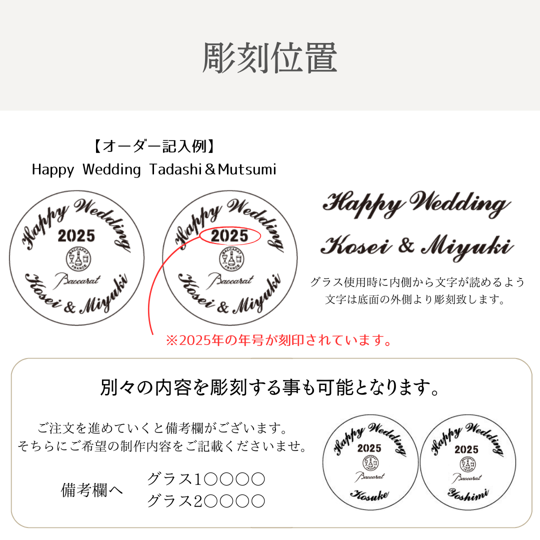グラスの底面には繊細なガラス彫刻で名前やメッセージを入れることができます。文字彫刻は底面の外側から彫刻するので、グラスを使う度に内側から見えます。