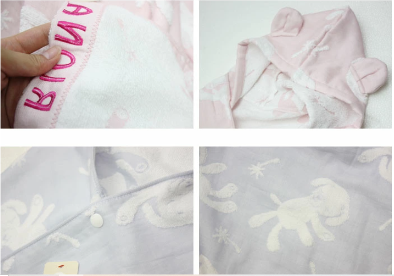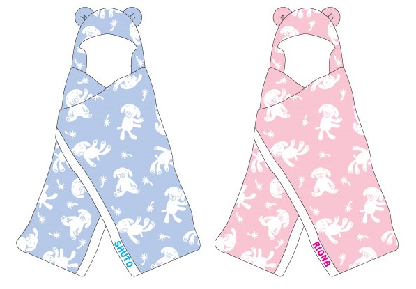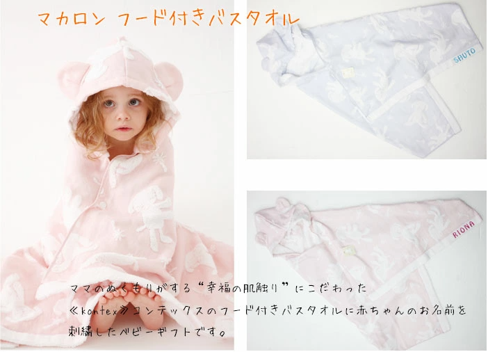「kontex(コンテックス)」がお届けする、名入れマカロンフード付きバスタオルです。柔らかなふわふわの肌触りのバスタオルにクマ耳のフードが付いています。全体に動物の可愛らしいデザインが施されていて、ポンチョの様に羽織れます。裾には太字で名前を刺繍できます。