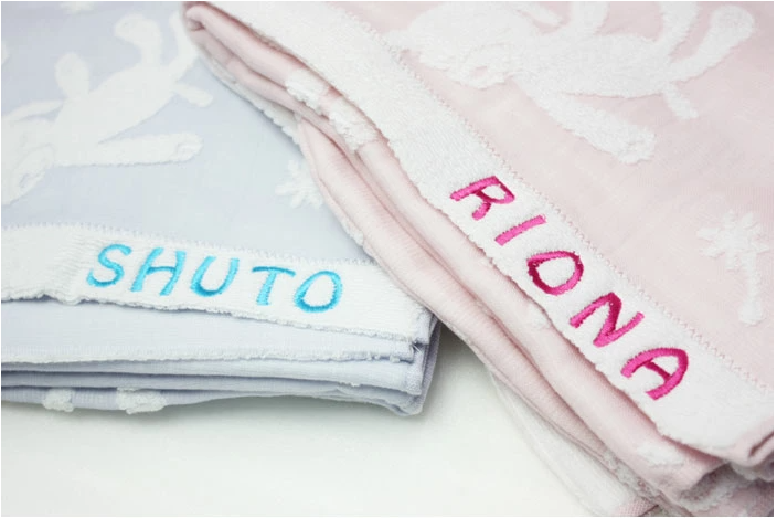 タオルと同じカラーの色で刺繍します。ローマ字、ひらがな、漢字の3種類の字体からお選びいただけます。
