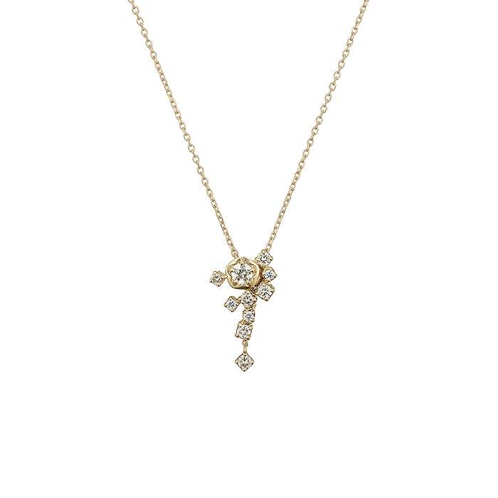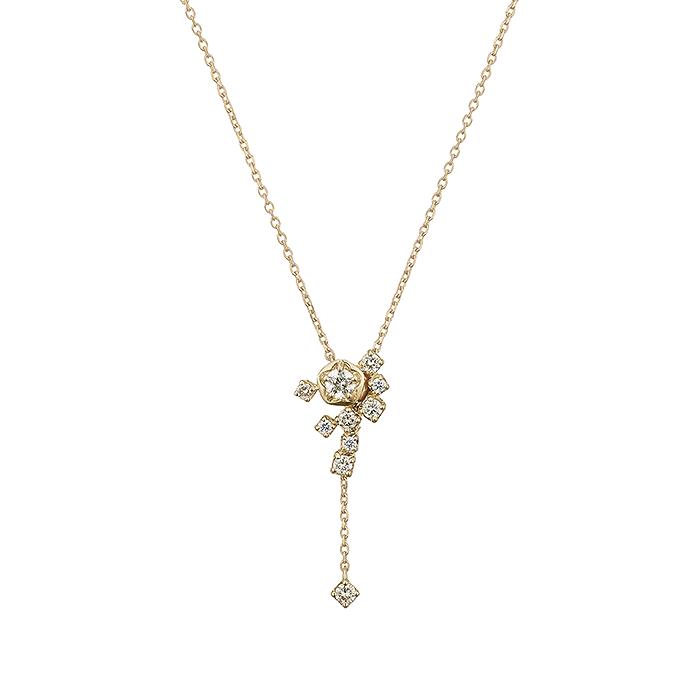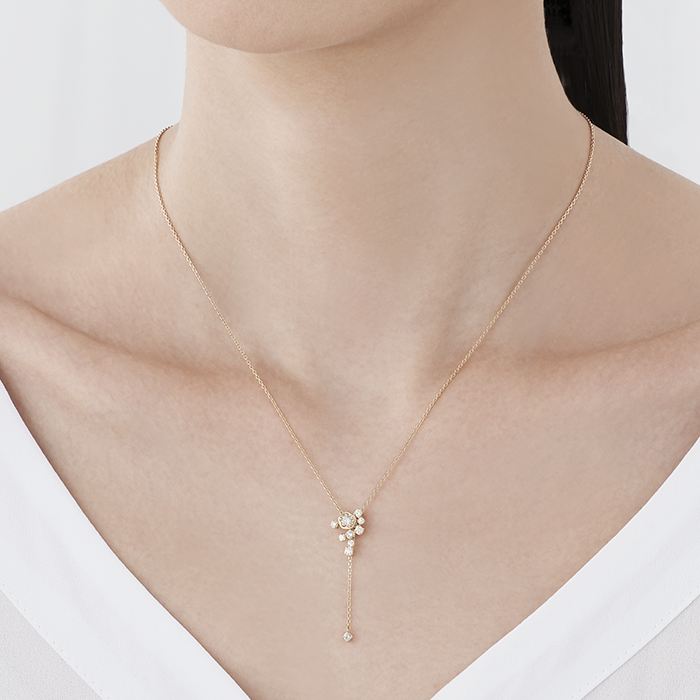 フリーチェーンなので日々のコーディネートにベストな長さに調整が可能です。シャンパンの泡が絶えず揺らめく様子をイメージしているため、先端の石座には裏にもダイヤが入っており、回っても美しい仕様になっています。