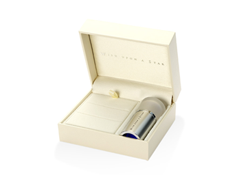 こちらのお品物は「Wish upon a starダイヤモンド」を使用しております。「Wish upon a star」ダイヤモンドに施された大小ふたつの星をご覧いただくための専用スコープ付きボックスに入れてお届けします。