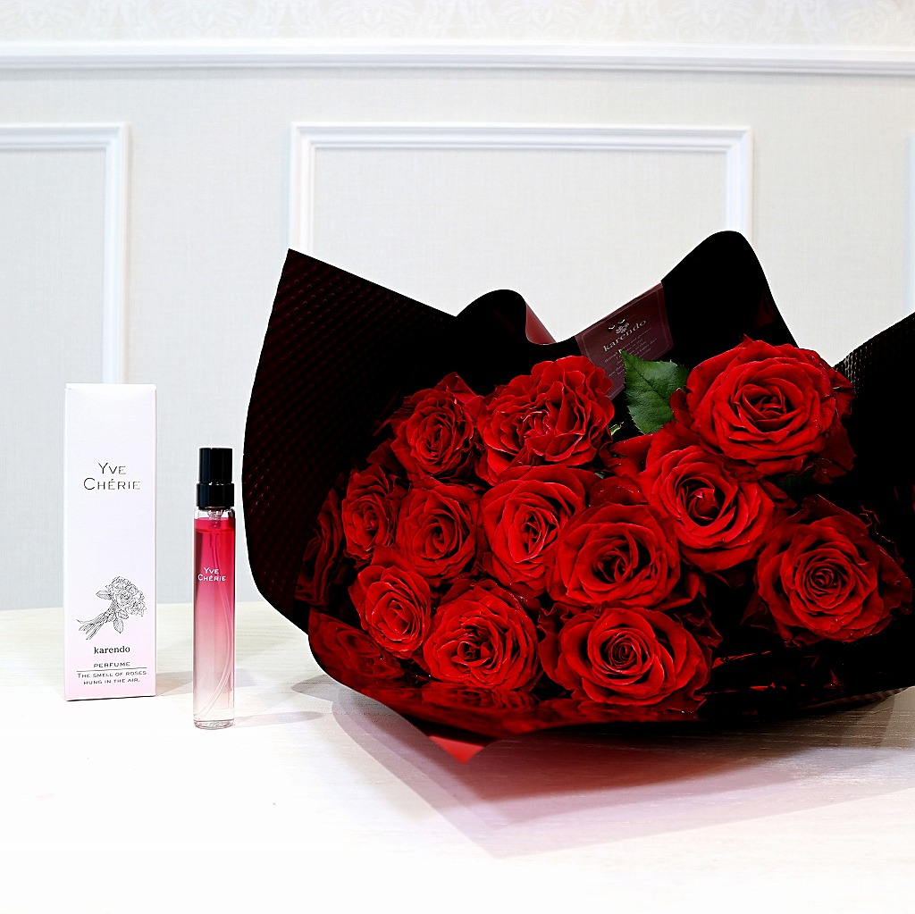 大口注文・法人のお問い合わせはこちら12本の赤いバラとバラの香水のサプライズ感溢れる商品です。12本のバラのブーケははヨーロッパの伝統的なプロポーズに使われるブーケです。
