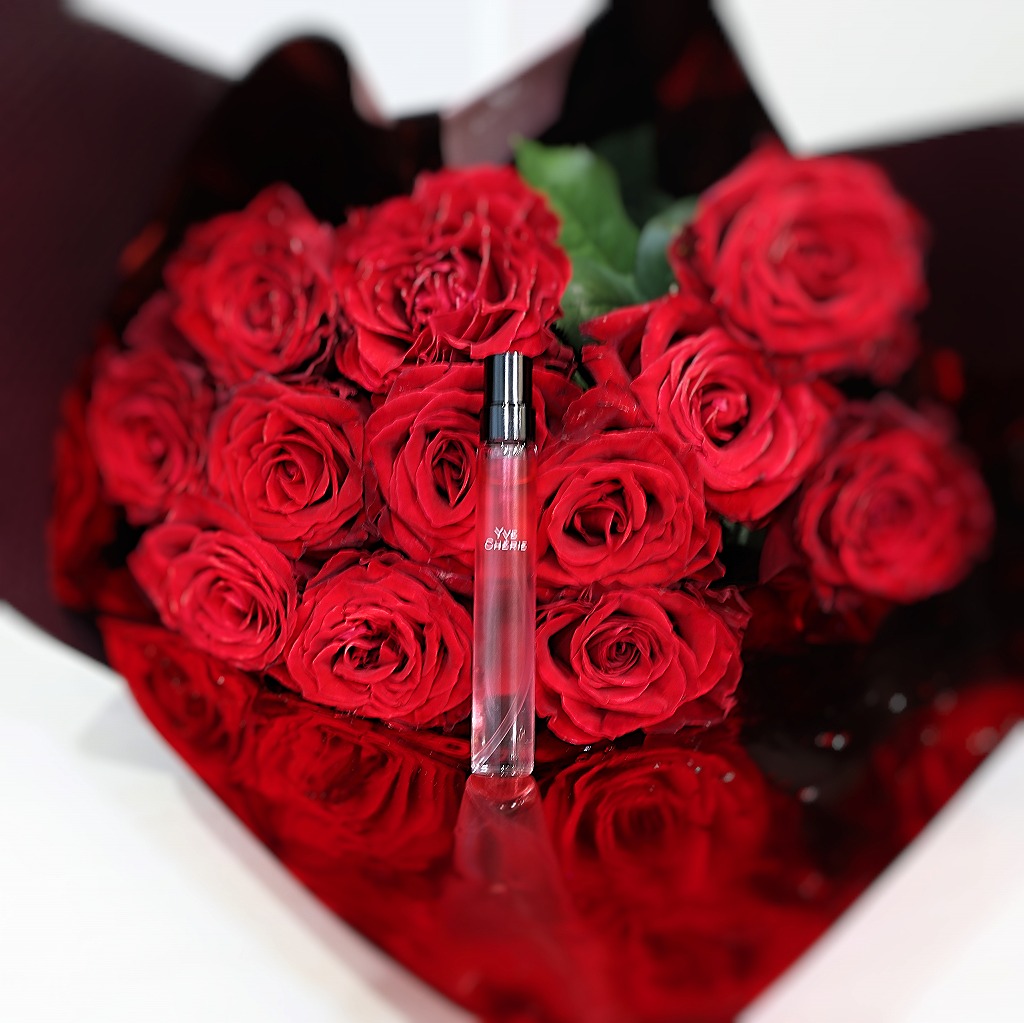 バラの香水はお花屋さんである私どもが香りにこだわって、最高級の香りと言われるバラ「イブピアッチェ」をたっぷり配合した香水です。香料不使用なので、本物のバラの香りを楽しめます。生花だと3日間しか楽しめない、貴重なバラの香りです。赤バラととバラの香水、この完璧な組み合わせにもらった方の感激する顔が目に浮かびますね。