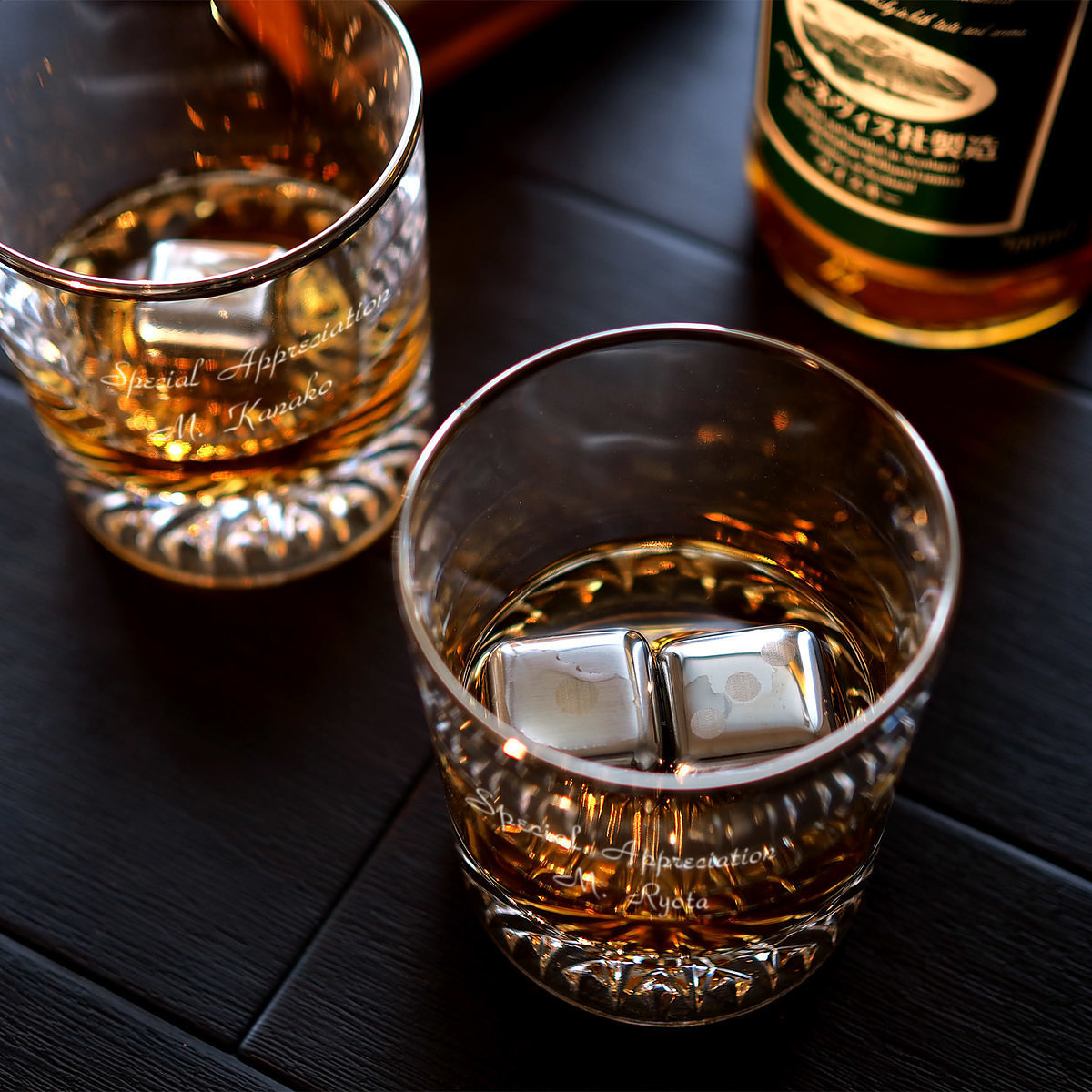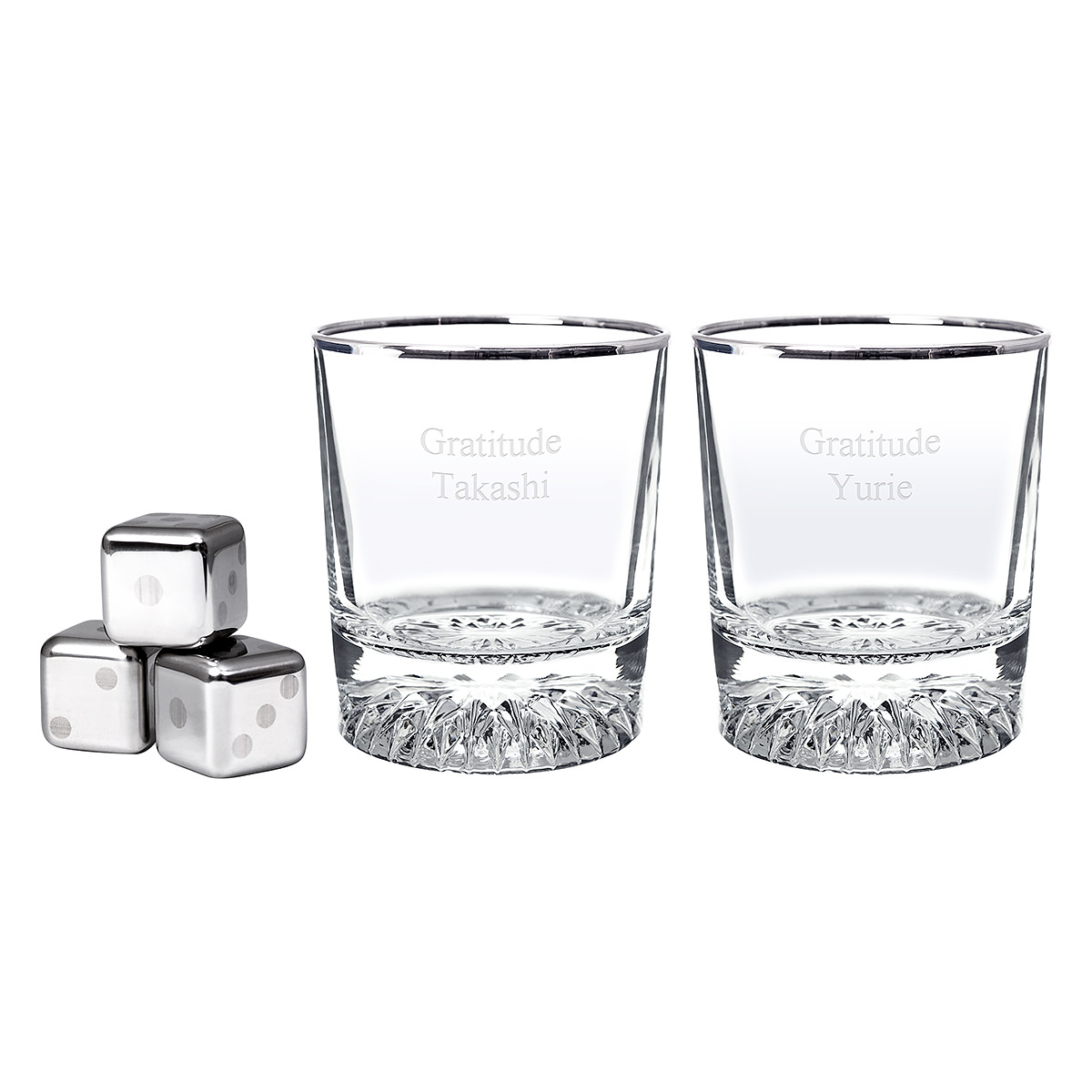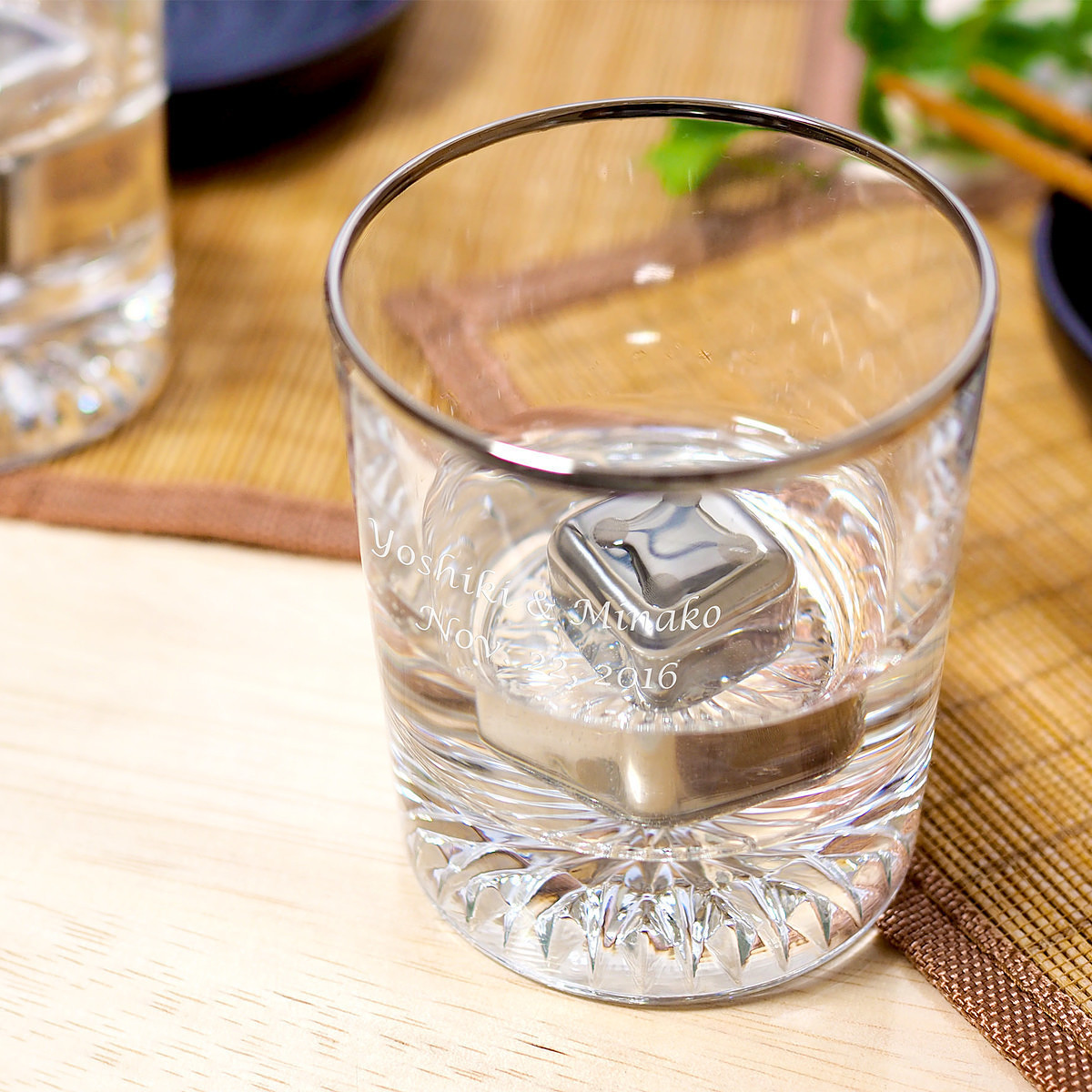 シーンやコンセプトに合わせたデザインやメッセージをレリーフ・プリントして、オーダーメイドギフトを創作している「2-U(トゥーユー)」から、氷の代わりに使えるステンレス製アイスキューブと底面のカットが美しいロックグラスのセットをお届け。ご希望のメッセージをお入れします。
