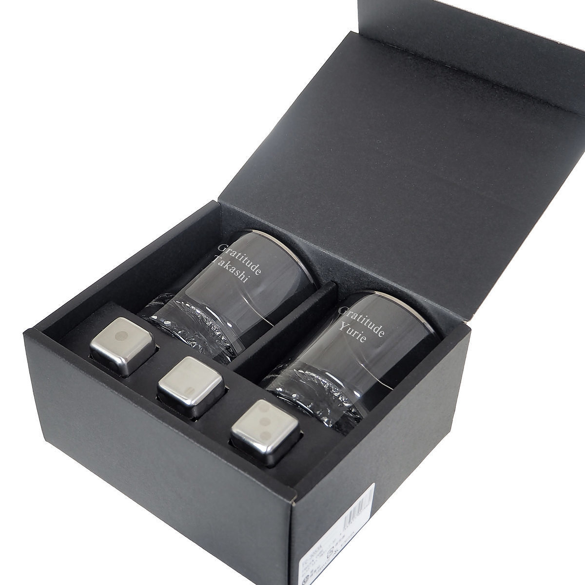 各グラスの側面にご希望のメッセージが入ります。黒い箱にセットされるのでグラスに刻んだメッセージが映えます。 ※イメージにはサンプルのメッセージが入っております。実際にはご希望のメッセージが入ります。