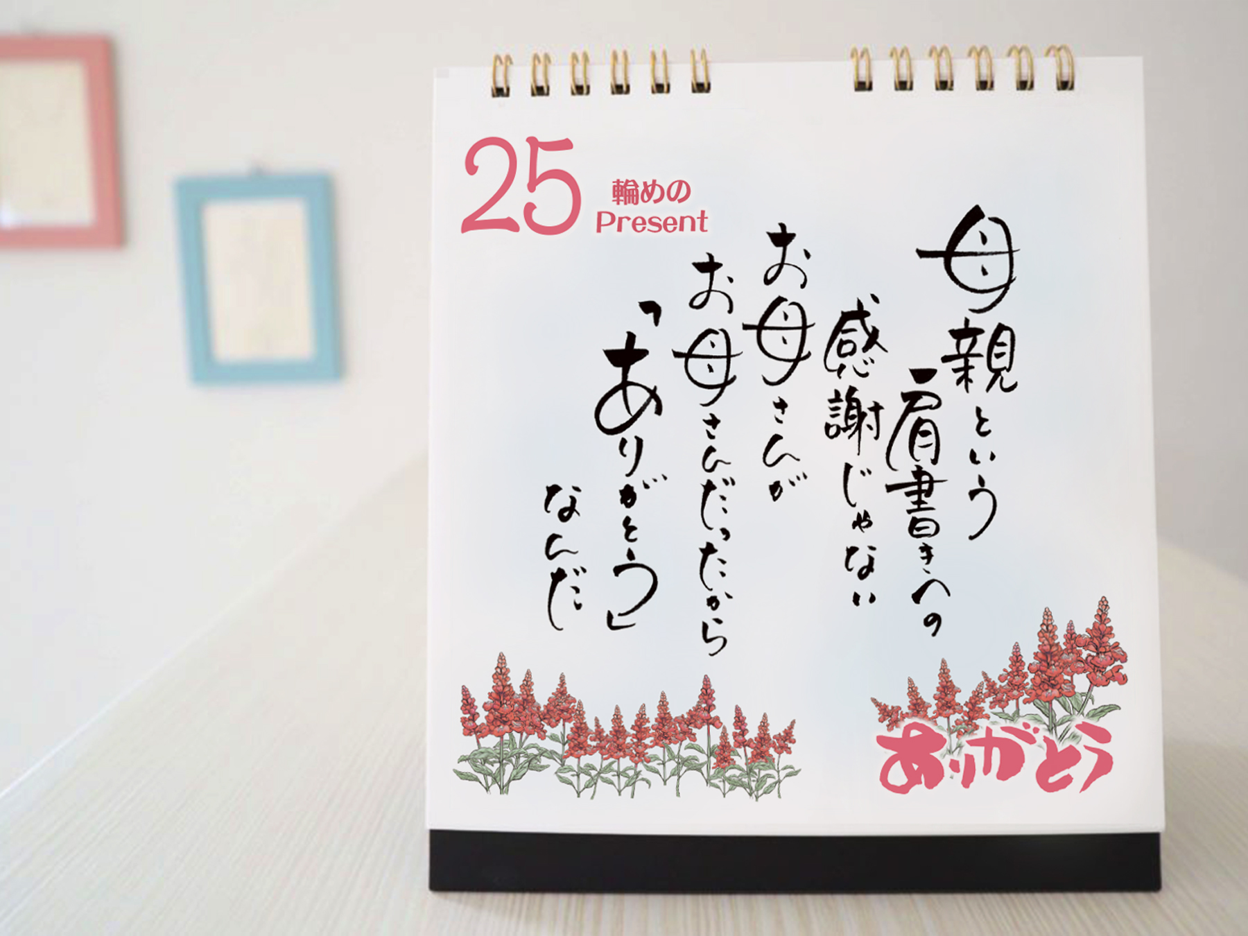 1日1つ、 じーん とする言葉を伝えながら、お花は1日1本ずつ咲き増えていきます。サルビアの花言葉は「家族愛」。カレンダーの中で日ごとに花の絵が増えるように、愛情あふれる言葉も満ちてゆき、やがて満開になる様は、きっとありがとうを伝えてくれるはずです。 「言葉」 は、幼い自分~大人目線まで、角度の違う「ありがとう」を書き下ろしました。書体は完全オリジナルの筆文字を印刷。まるで「声」が聞こえるかのように、活字に命を吹き込み、ぬくもりを伝えます。 ひとつの文章でも、お母さんが100人いれば100通りの想い出があるので、解釈はそれぞれと思います。そんな、思い思いの情景が浮かぶようなプレゼントのお手伝いができれば幸いです。お菓子やその他プチギフトに添えて贈っても喜んでいただけると思います。 ※カレンダーは卓上可・壁掛け可(ハンガー付)
