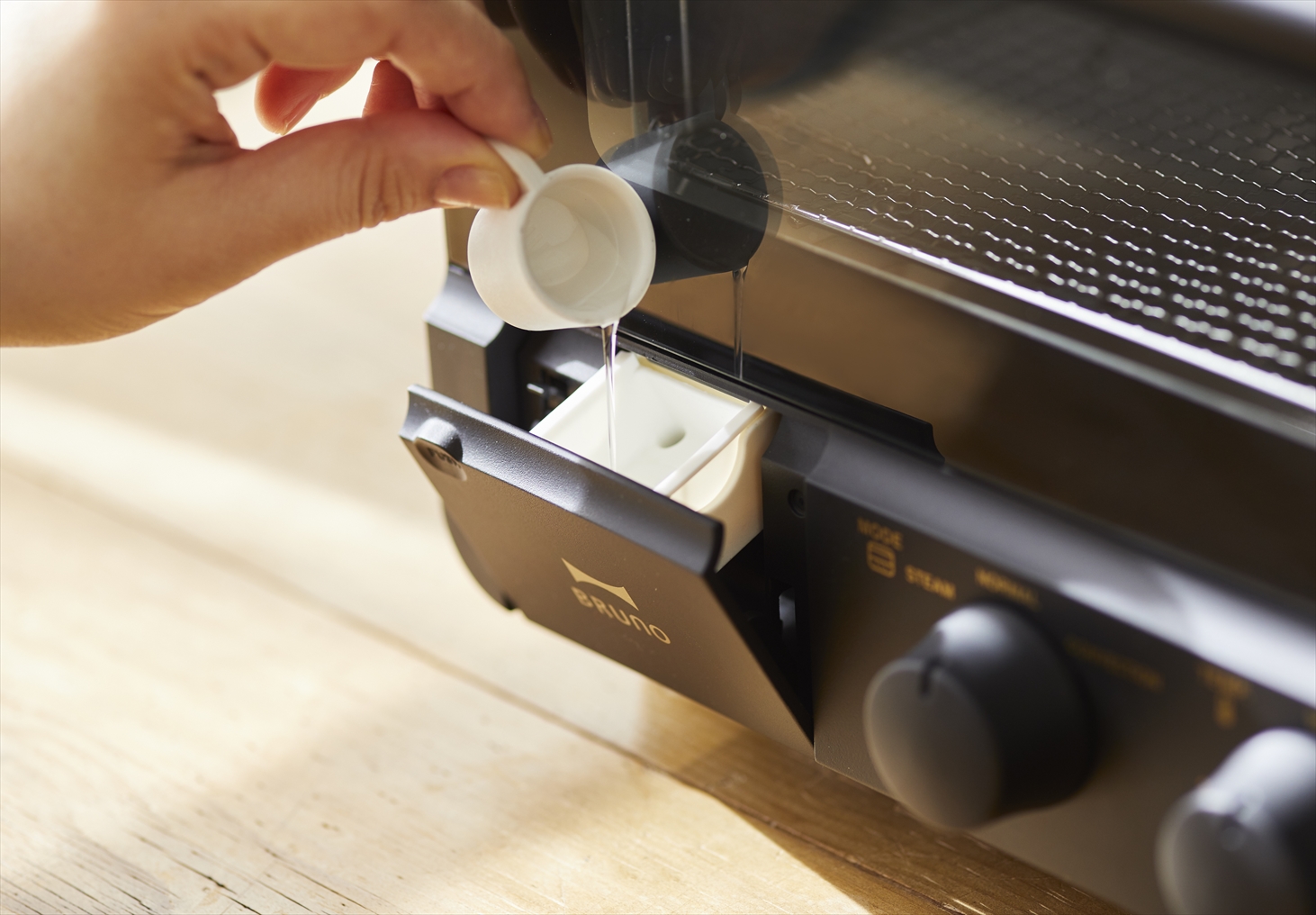 5mlの水を入れて焼くだけで、いつものトーストが外はカリッと、中はもっちりふわふわな驚きの食感に焼き上がります。