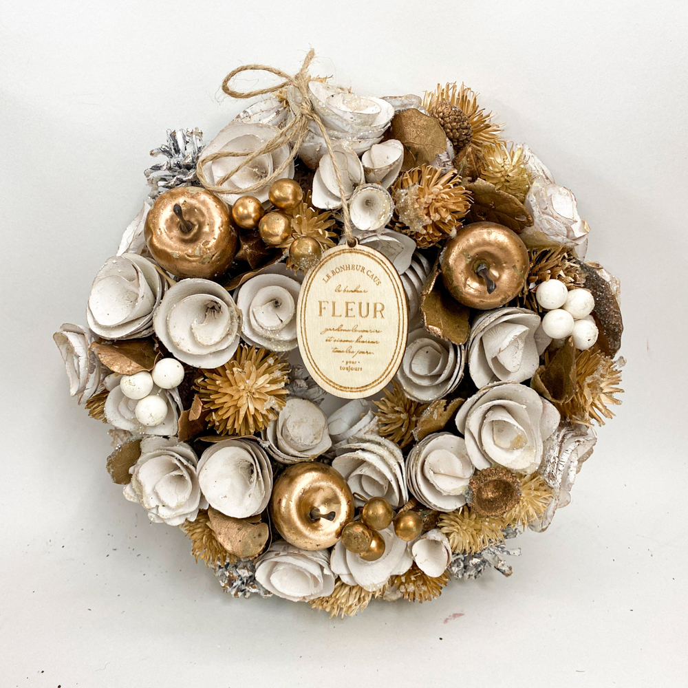 「Q-FLA(キューフラ)」がお届けするクリスマスリースMです。白い花がちりばめられたリースに、バランス良くあしらわれた金色の装飾がお互いを引き立て合い、豪華な印象を与えます。紙製のスタンド付きなので、壁掛けだけでなく卓上に置いて飾ることもできます。