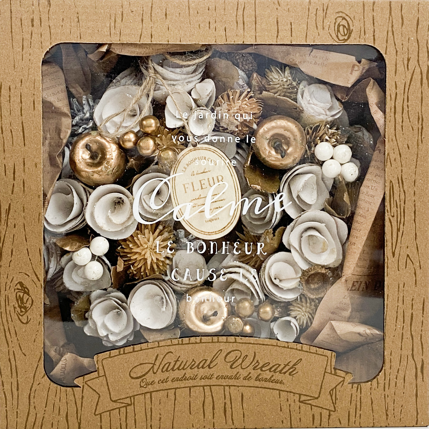 ナチュラルな印象のラッピング箱に入れてお届けします。周りが木目のデザインで、中央部分はリースが見えます。リースを箱から出すのが楽しみになりますね。
