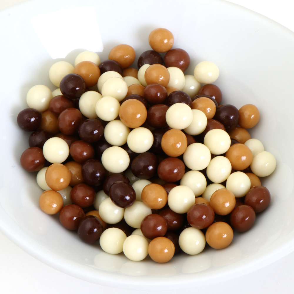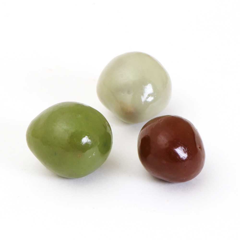 フランス産のヘーゼルナッツを見た目も美しい3種のチョコレートでカラフルにコーティングしています。茶系のチョコレートはミルクチョコレート、薄緑のチョコレートはホワイトチョコレートでコーティングされています。スパイスにウイキョウとティユールを混ぜ込んで仕上げているので、上品な味に仕上がっています。