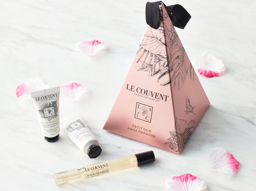 100%ヴィーガンフレグランスブランド「クヴォン・デ・ミニム」のプティデュオ アクアパラディシです。「アクアパラディシ」のフレグランスと2種のミニボタニカルハンドクリーム2種が入ったセット。日本限定商品で、ピンクカラーのピラミッド型パッケージも印象的です。
