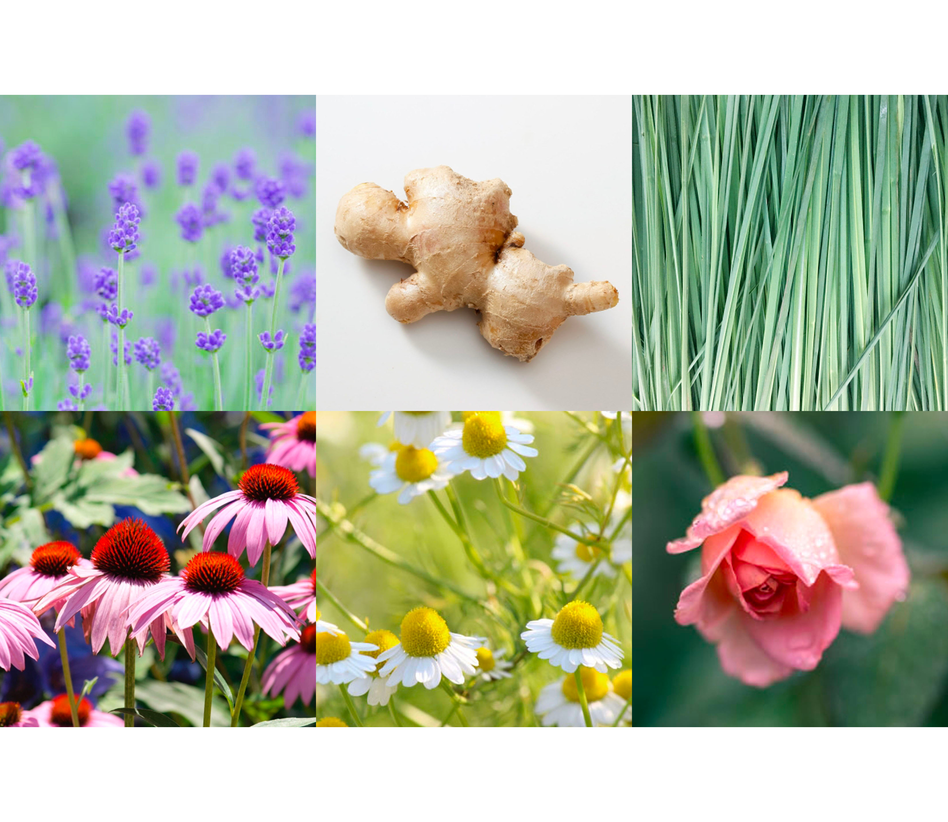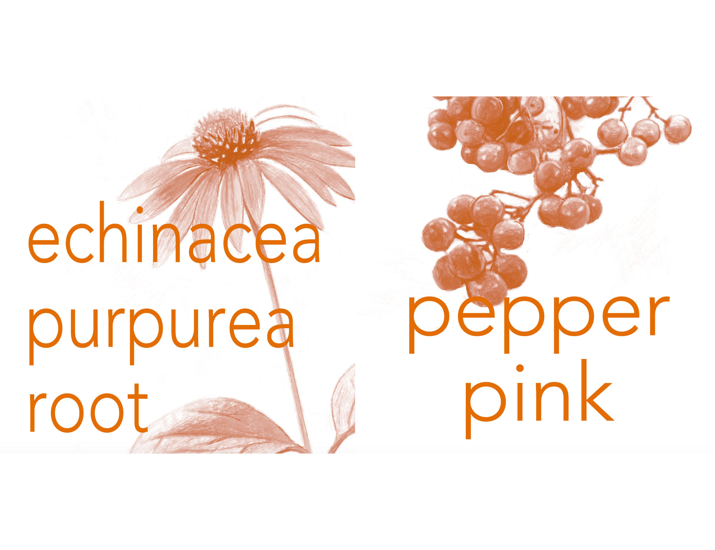 echinacea purpurea root / エキナセア ルート:弱った心と身体に活力を与えます。 pepper pink / ピンクペッパー:心と身体を温め、元気にさせます。 eucalyptus leaf / ユーカリ リーフ:心と身体を浄化し、リフレッシュさせます。 orange mandarin peel / オレンジ マンダリン ピール:弱った心と身体をやわらげ、リラックスさせます。 rosemary / ローズマリー:心と身体をすっきりさせ、エネルギーを高めます。 lavender / ラベンダー:張り詰めた心を深く落ち着かせます。