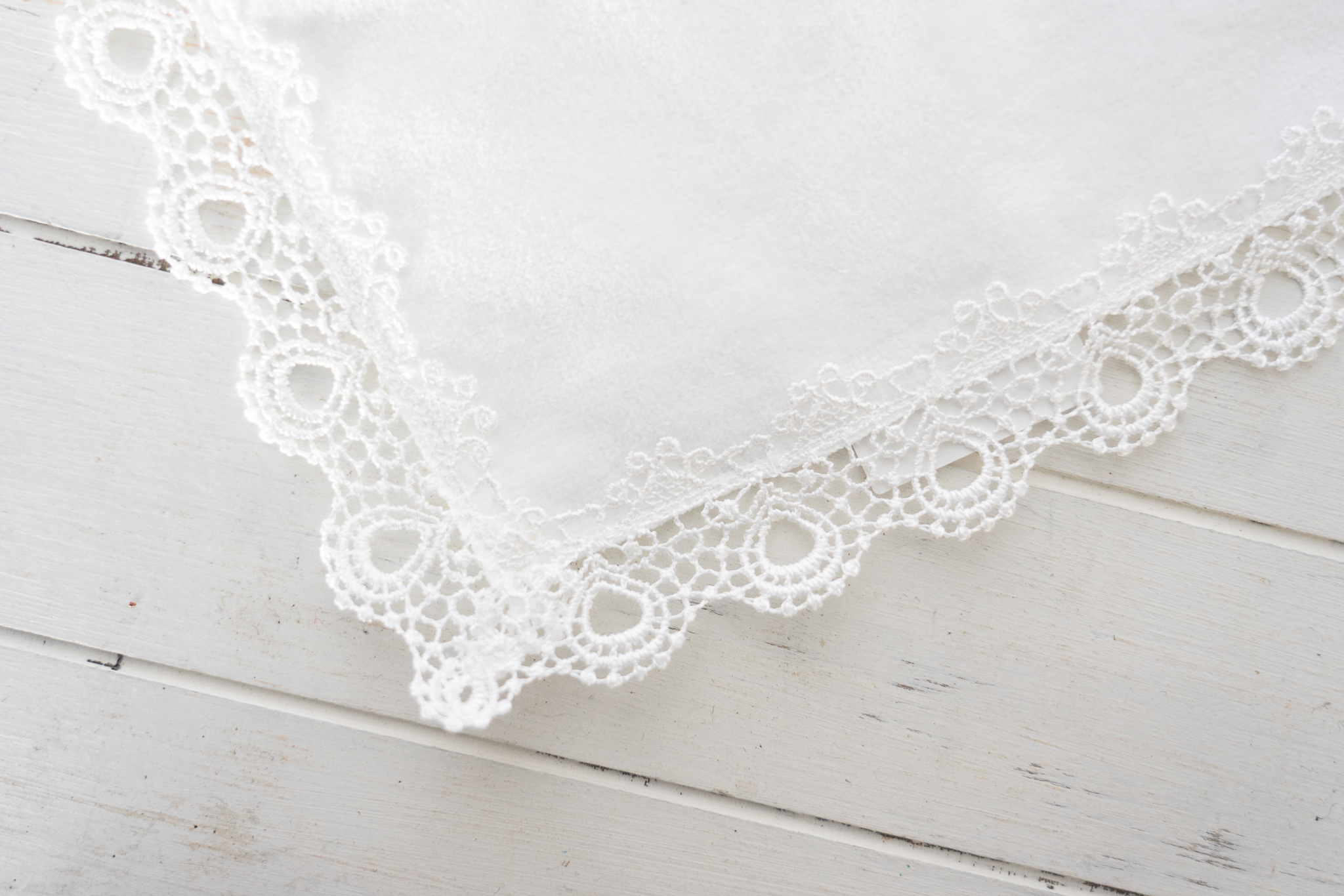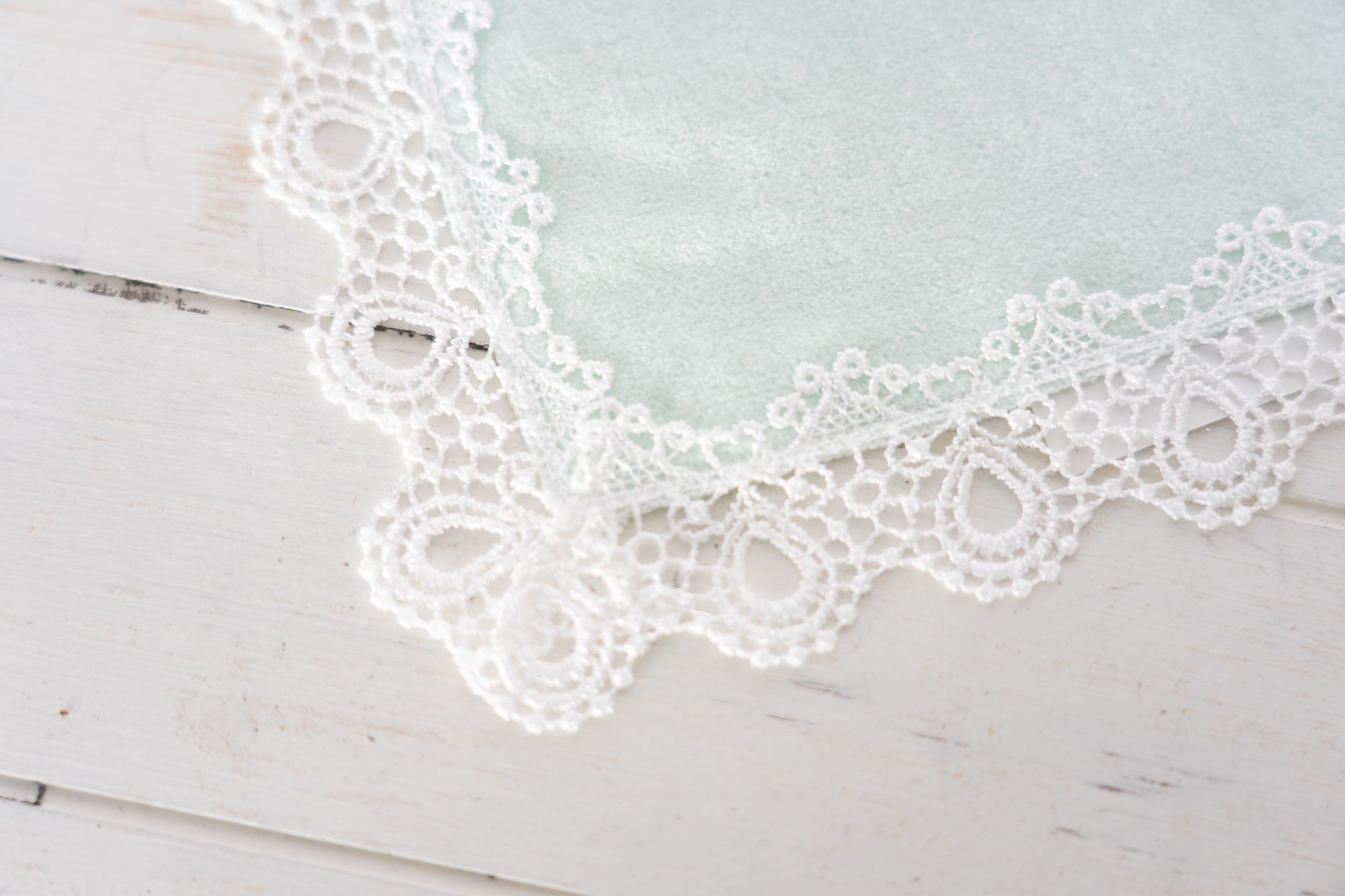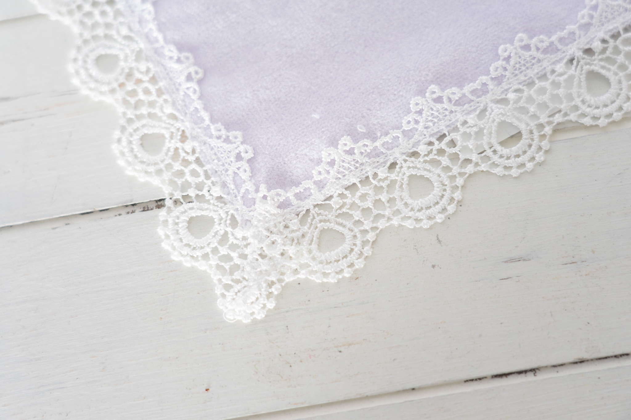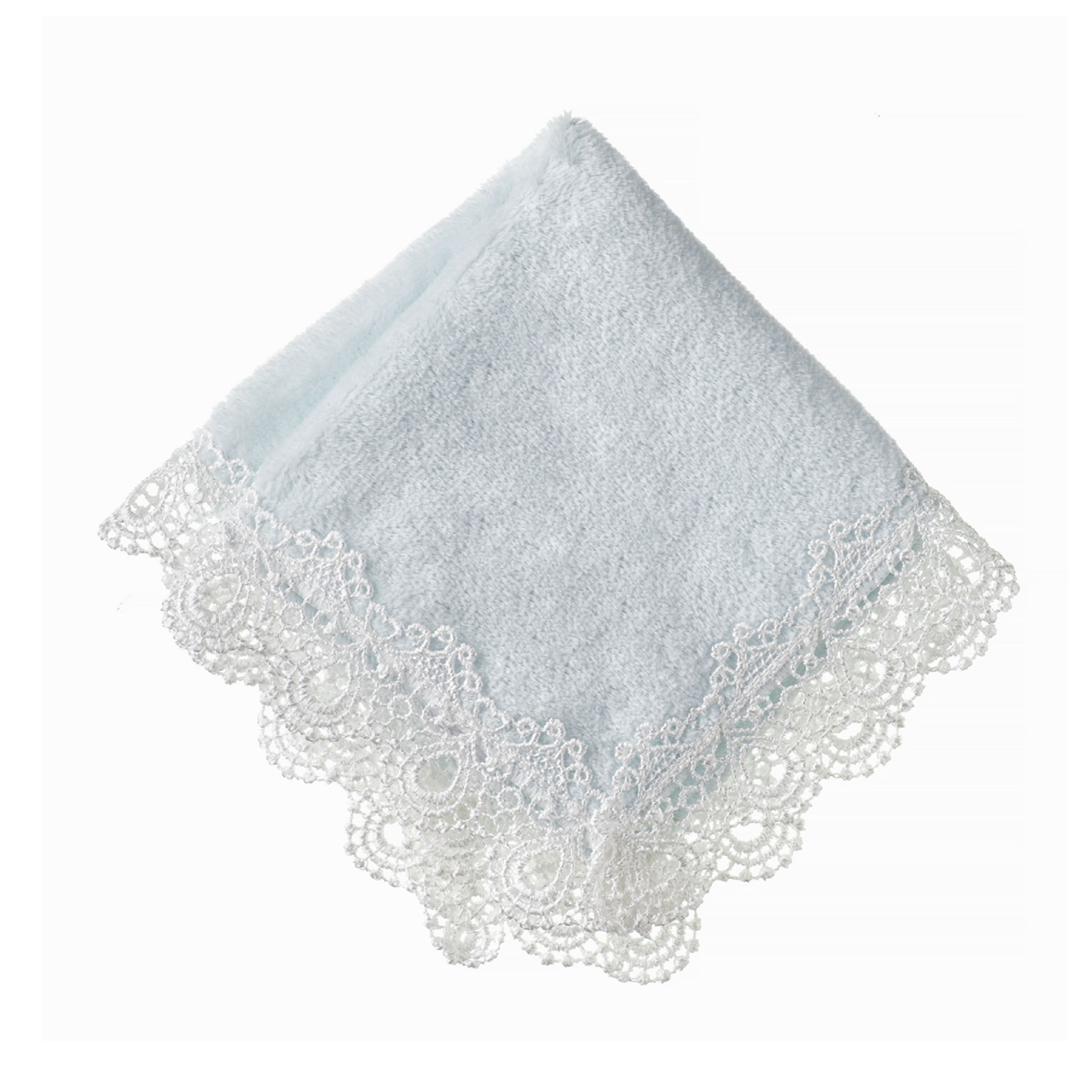 実用的で美しいハンカチをコンセプトに作られ、日本有数のタオル産地 今治産のタオル地を使用し、ふっくらとした肌触りが特徴的なタオルハンカチです。 表面にはパイルループをカットしたシャーリング加工を施し、ベルベットのような質感で高級感を演出しています。 タオルの周りに贅沢にあしらったレースが最大の魅力です。