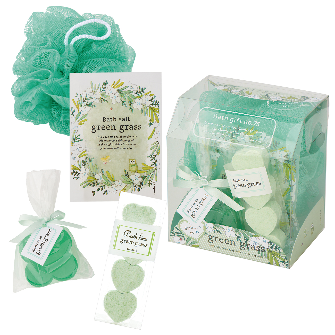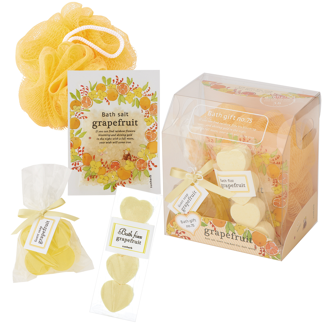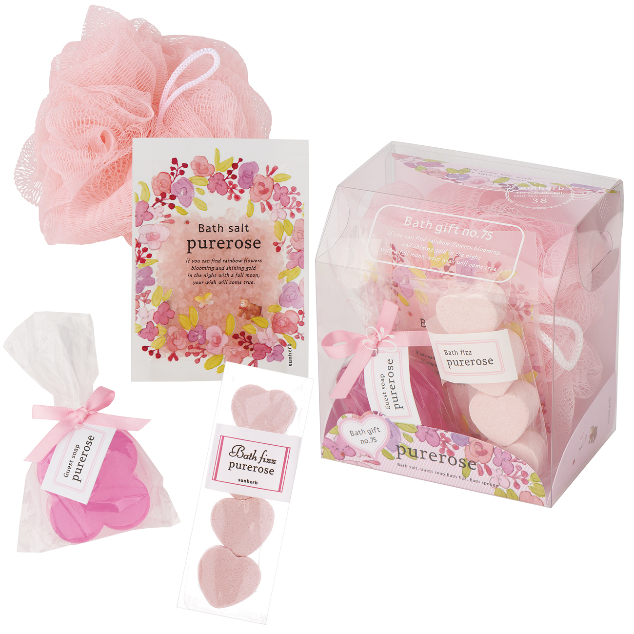 バスグッズは、バスソルト、ゲストソープ、バスフィズ、バススポンジが入った豪華なセットになっています。