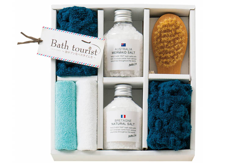 ソルト、タオル、クロス、ブラシの入ったお風呂にピッタリのセットです。旅気分で、お肌がうるおう至福のバスタイムが楽しめます。
