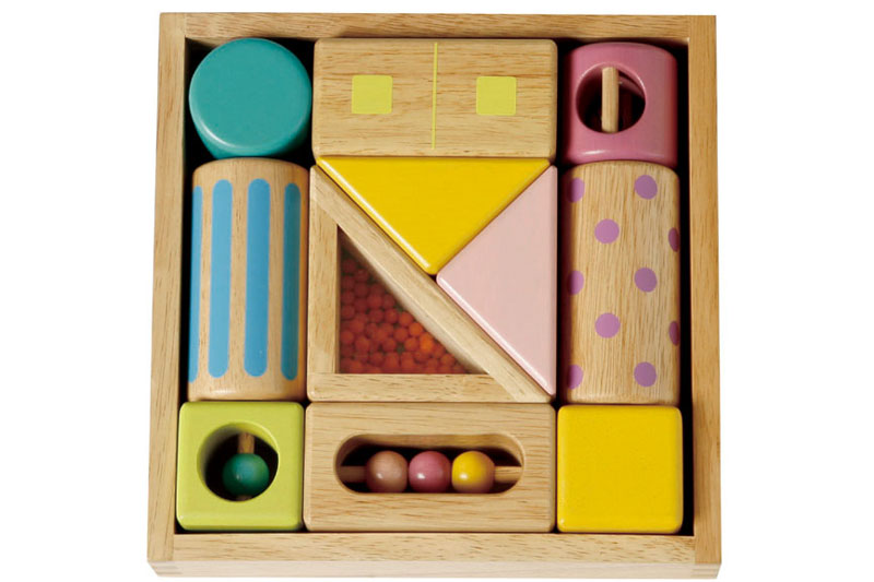 大口注文・法人のお問い合わせはこちら見て楽しい、振って楽しい、積んで楽しい積み木。 きれいな色と心地良い音が、心を育みます。 また、あたたかい木目にカラフルな塗装がされていてデザイン性もあります。
