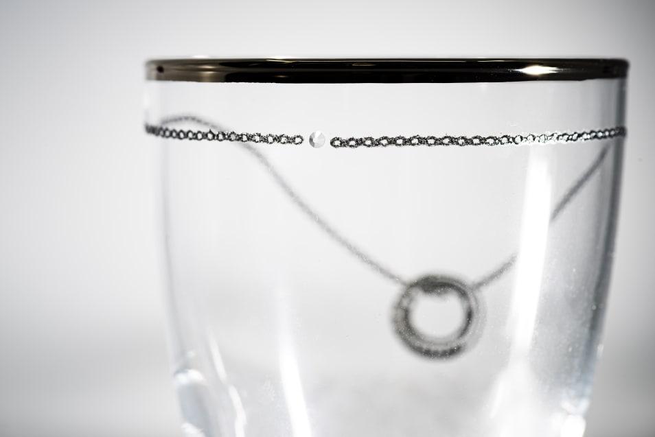 グラスの背面には、きらきらと輝くクリスタルが手作業でセッティングされており、贅沢な気分を味合わせてくれます。