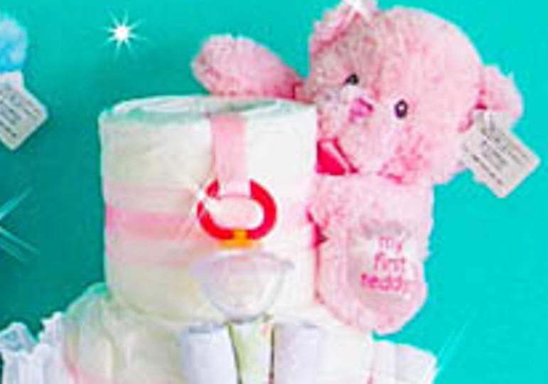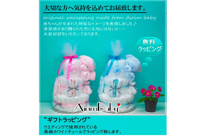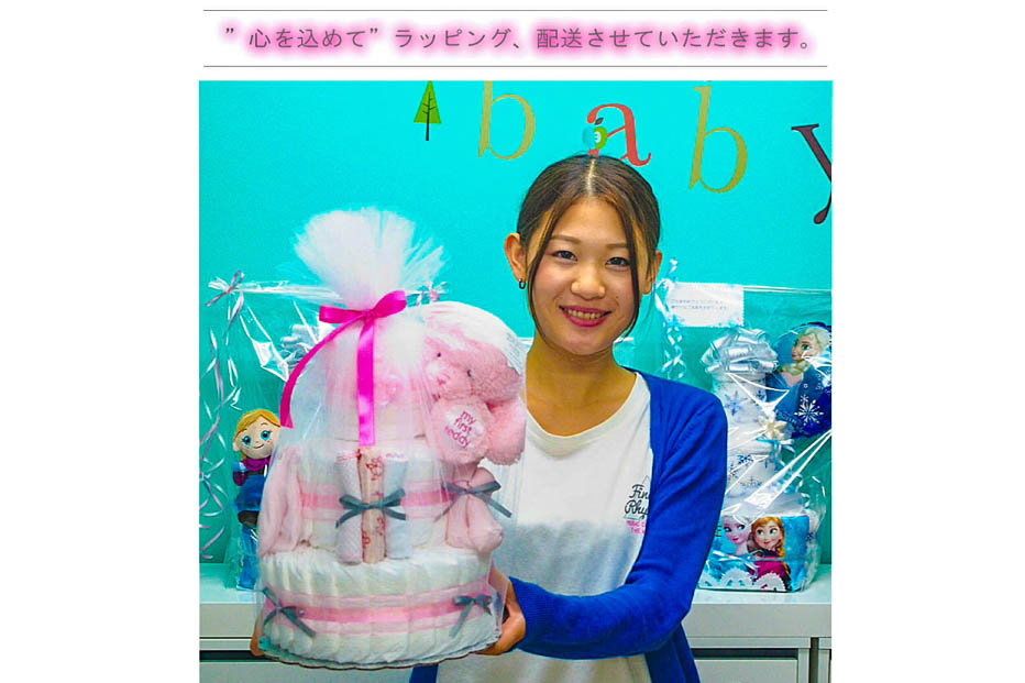 大口注文・法人のお問い合わせはこちらおむつケーキとは、赤ちゃん用の紙おむつでケーキに見立てた形を作り、リボンやぬいぐるみなどの可愛らしい飾りやベビー用品などで、まるでデコレーションケーキのように飾りつけて仕上げたアメリカ発祥の出産祝いDiaper Cake(ダイパーケーキ)(diaper=おむつ)のことです。 かわいらしい見た目と、おむつやおもちゃなどを使った実用性が高く人気があり、 近年では日本でも赤ちゃんへの出産祝いのギフトとしてもよく贈られています。