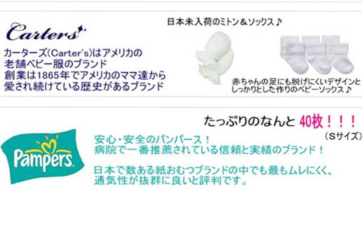 | おむつ | Sサイズ34枚(Sサイズ目安2~5ヶ月前後) Mサイズ28枚(Mサイズ目安3~12ヶ月前後) Lサイズ23枚(Lサイズ目安9~15ヶ月前後) |