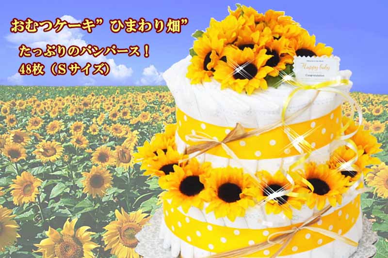 横35cm 高さ40cmの大きなおむつケーキです。 おむつケーキの上には本物のように綺麗なひまわり畑が広がっています。 このアートフラワーは発色から手触り感までこだわり、厳選しているとっておきの出産祝いにピッタリのギフトです。