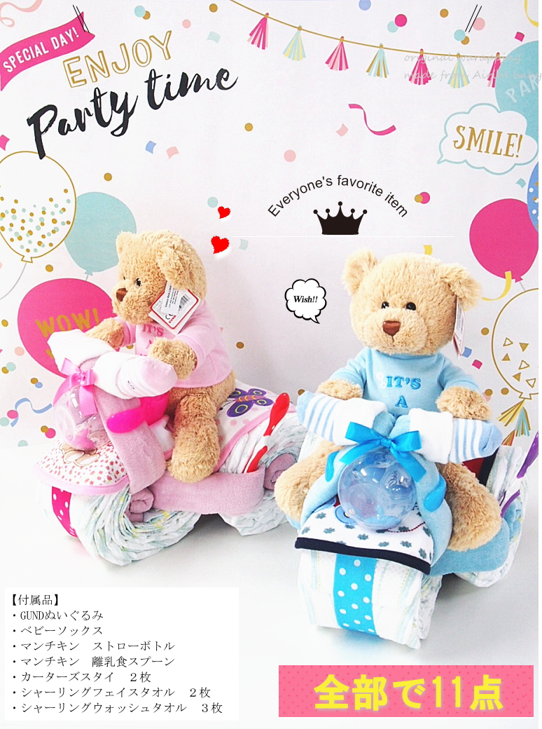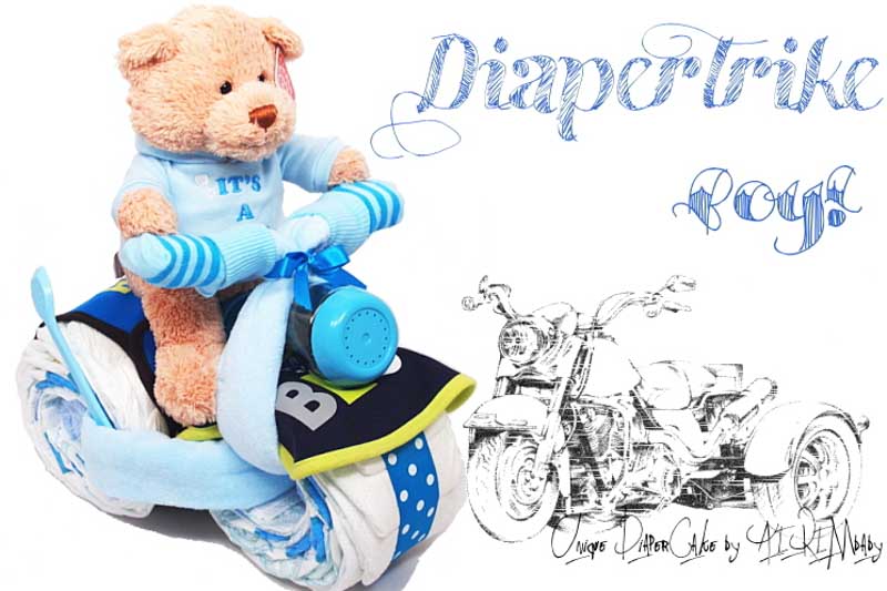 大口注文・法人のお問い合わせはこちらベビーグッズがいっぱいに詰め込まれたダイパートライク。 Diper Trike(ダイパートライク)(diaper=おむつ trike=三輪バイク)オムツで出来た三輪車のことで、初登場しました。 パンパースのおむつ、ぬいぐるみ、ベビーカップ、スタイ、フェイスタオル、ベビーソックス、ハンドタオル、ファーストスプーン… なんと8種類ものベビーグッズが入っています! 出産祝いとして贈れば、見た目の可愛さと実用性で大喜びされること間違いなしです!