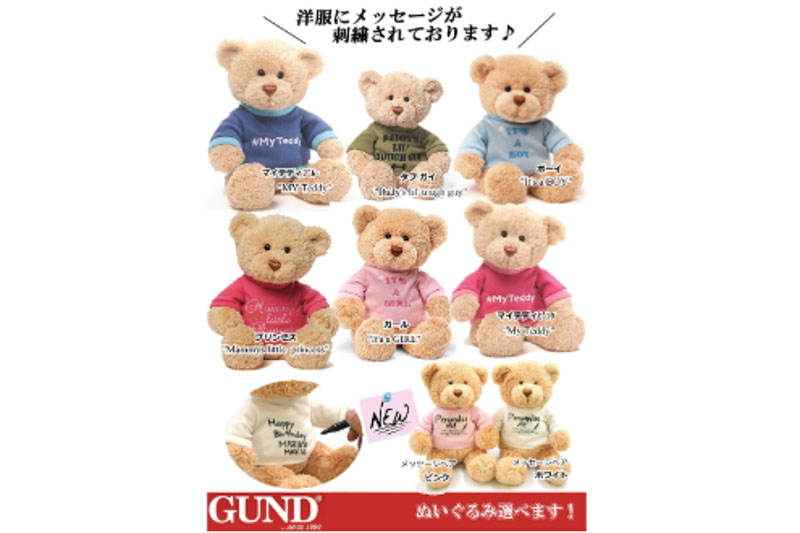 ハリウッドで人気のガンドベビーは、可愛らしく温かみのあるぬいぐるみを作ることをモットーに掲げています。 ふわふわの肌触りが楽しめるぬいぐるみは、8種類の中からお選びいただけます。 マイテディブルー、タフガイ、ボーイ、プリンセス、ガール、マイテディピンク、メッセージべアのピンクとホワイトです。 メッセージベアは、ぬいぐるみのTシャツにお好きなメッセージを手書きすることができます。