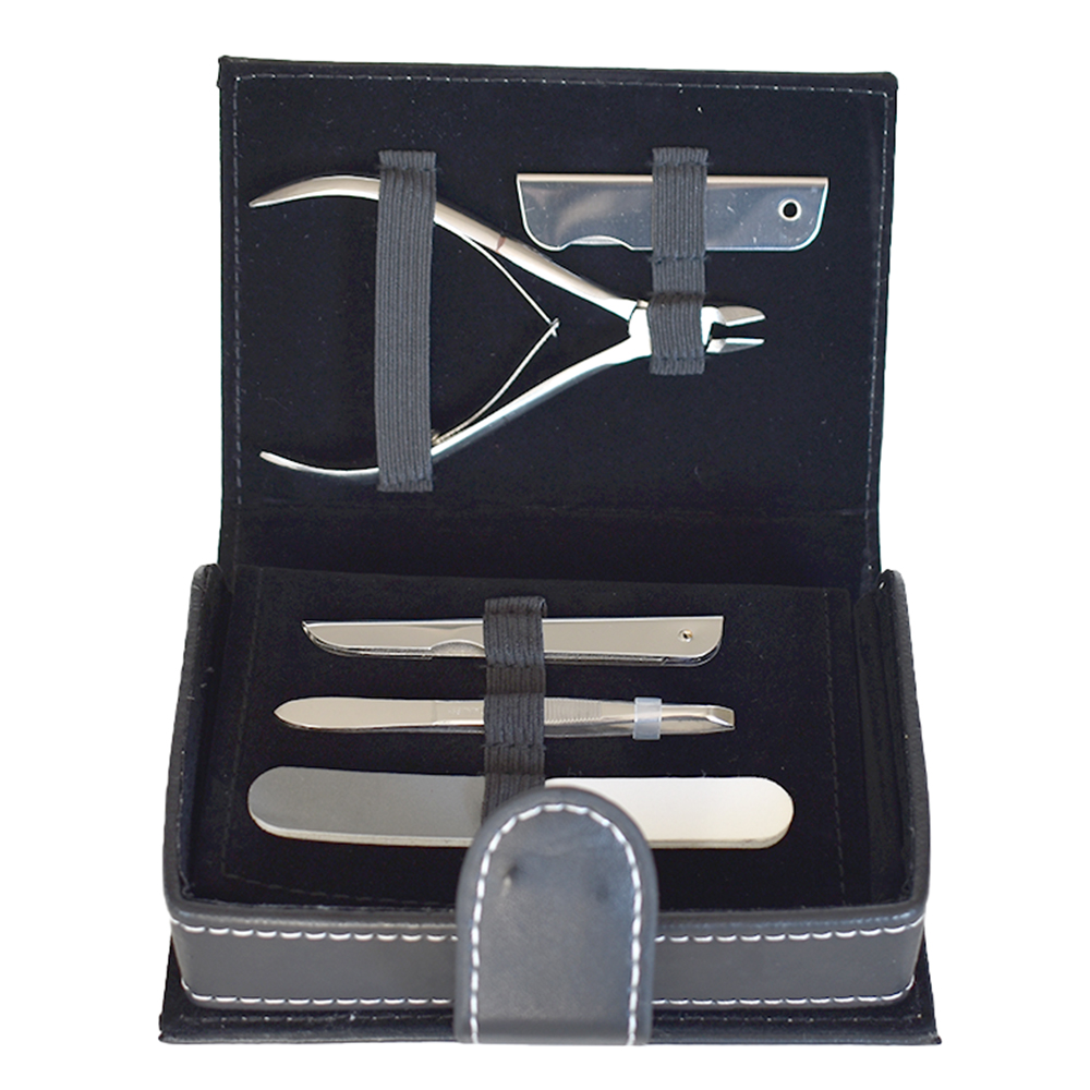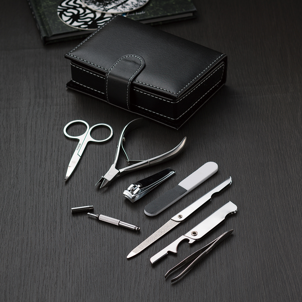 大口注文・法人のお問い合わせはこちら男性の身だしなみケアに欠かせない、8種のアイテムをコンパクトなケースにまとめました。持ち運びにも便利なセットになっています セット内容 ・ケース(13.2×9.7×4cm、ポリウレタン) ・簡易ナイフ(10.5cm、スチール・クロムメッキ) ・ニッパー型爪切り(10.3cm、ステンレス) ・毛抜き(8cm、ステンレス) ・折込やすり(13.7cm、カーボン鋼) ・ヤスリ(9cm、スポンジ・サンドペーパー) ・ミニドライバー(6.7cm、銅・クロムメッキ) ・ハサミ(9cm、ステンレス) ・爪切り(5.6cm、カーボン鋼・クロムメッキ) ×各1