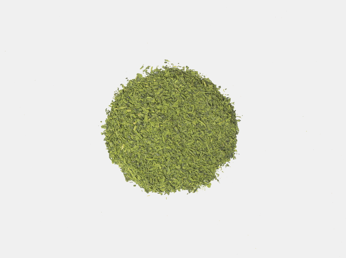 抹茶をブレンドした、鮮やかな色合いと、甘みのあるすっきりとした味わいが特徴の煎茶です。カットの際に加わる熱を考慮し、前段階の火入れの加減を繊細に調整、豊かな香りが際立つよう仕上げました。