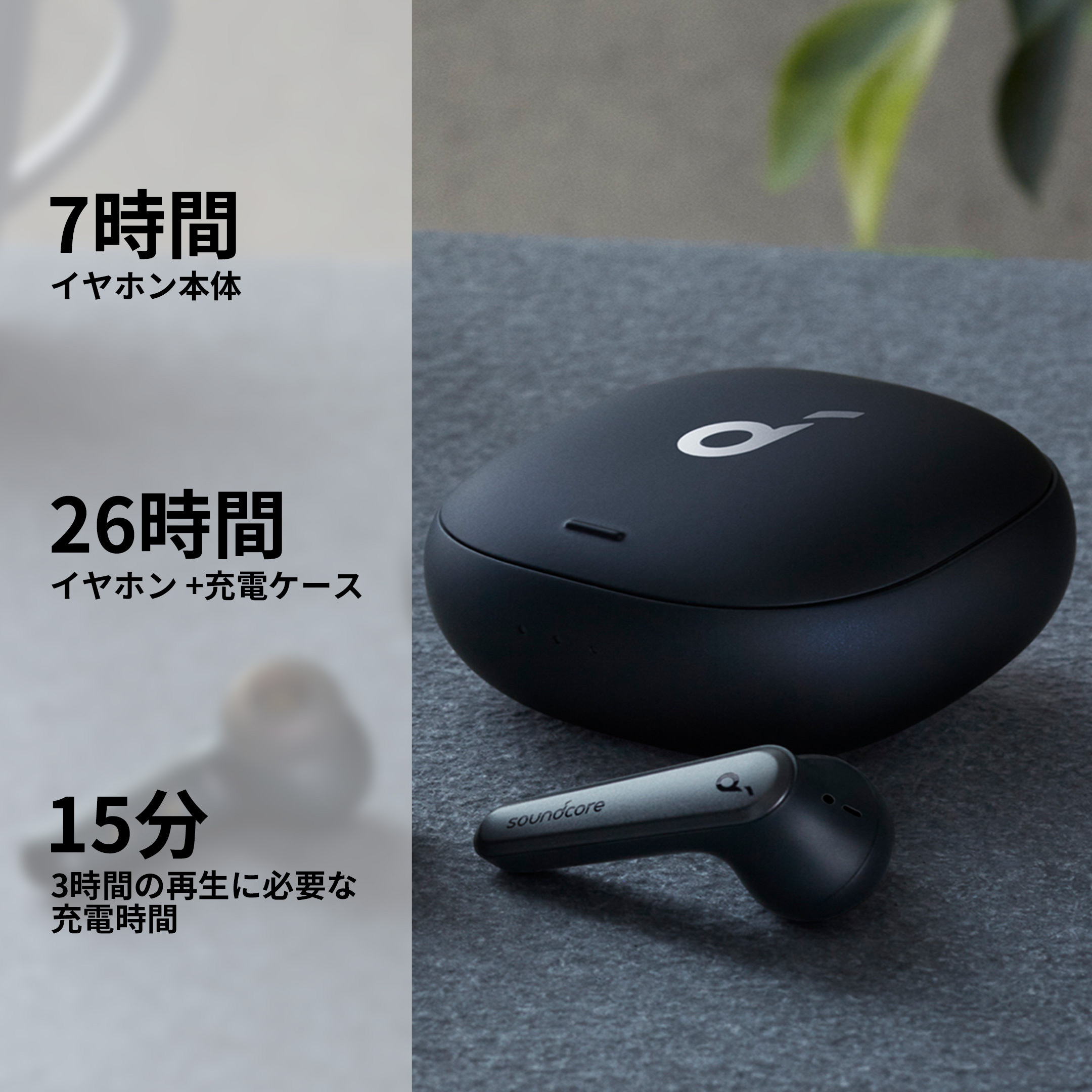 通常モード:最大7時間(イヤホン本体のみ) / 最大26時間(充電ケース使用時) ノイズキャンセリングモード:最大6時間(イヤホン本体のみ) / 最大21時間(充電ケース使用時) 短時間充電に対応し、15分間の充電で約3時間の音楽再生が可能です。 (※再生可能時間は、音量、再生する内容、使用環境によって異なります)