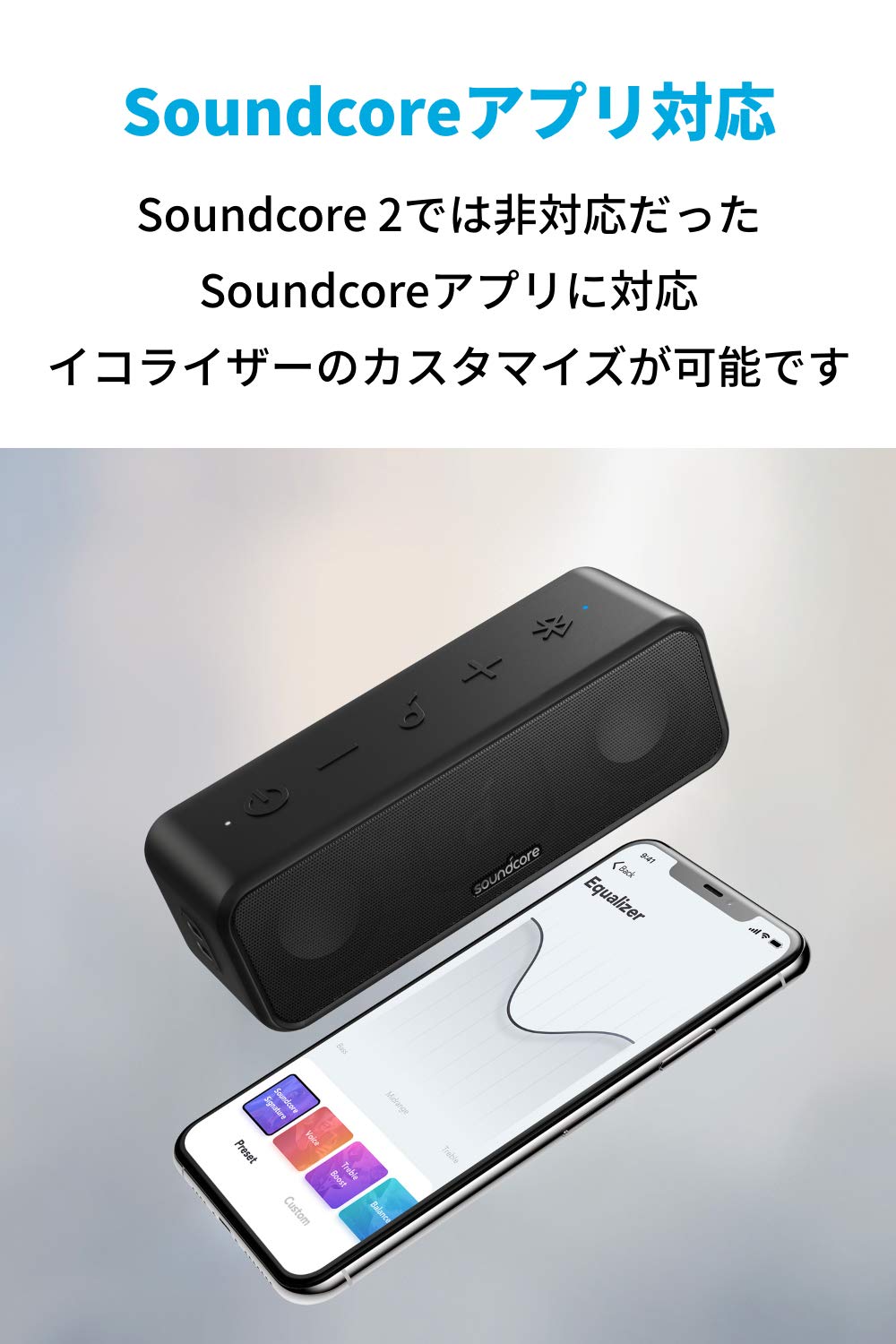 前モデル「Anker SoundCore 2」では非対応だったSoundcoreアプリに対応し、アプリから イコライザーのカスタマイズが可能になりました。 4種類のプリセットかカスタムイコライザーを簡単に切り替えることができます。