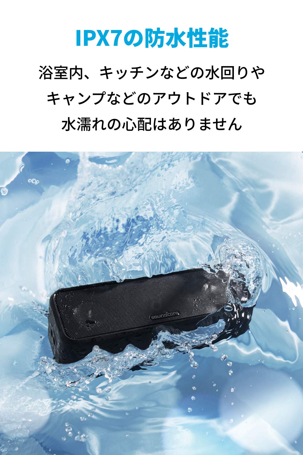 家でも外でも防水&長時間再生で大活躍の高音質Bluetoothスピーカー「Soundcore 3」IPX7対応の防水規格で、お風呂場やアウトドアでの使用も可能です。最大24時間の連続再生が可能なので、家でも外でも迫力の音質を楽しみたいアクティブな方におすすめです。