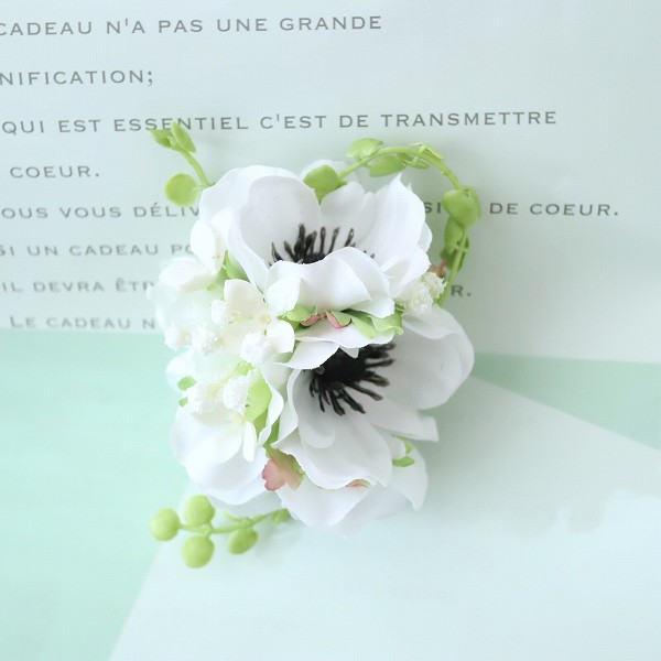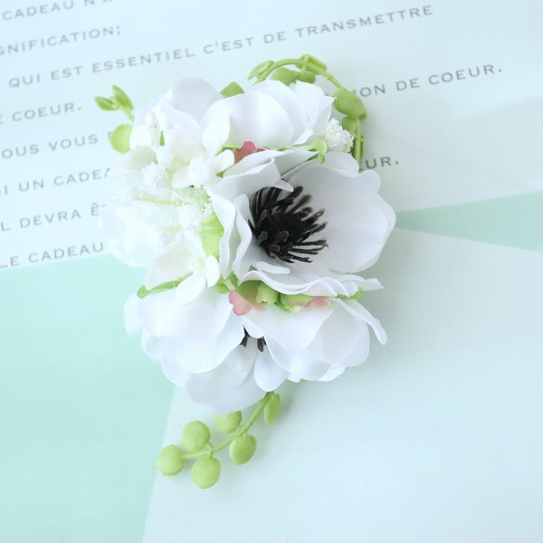 他店とは被らない「アトリエ美鈴」だけのオリジナルコサージュ。シンプルで上品なホワイト系のアネモネと小花をまとめたコサージュです。派手さや華やかさよりもすっきりと控えめな美しさがあり、大事な式典やフォーマルな場にも合わせやすいデザインです。
