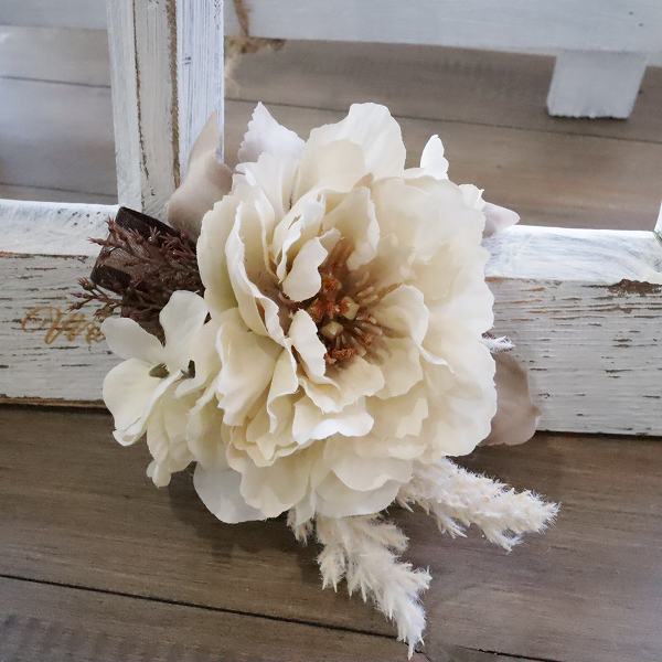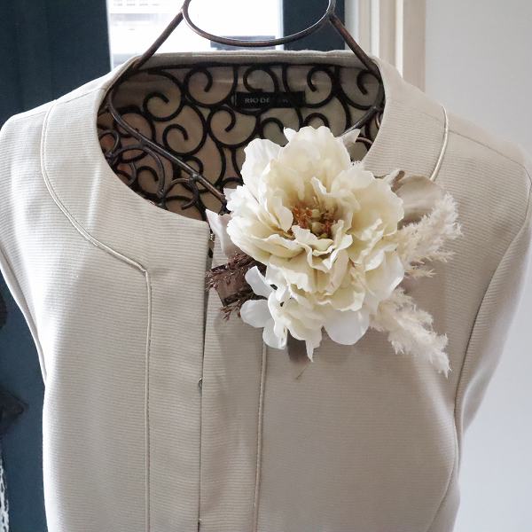 他店とは被らない「アトリエ美鈴」だけのオリジナルコサージュ。ドライフラワー風の少しスモーキーなピオニーと、リアルなパンパスなどがトレンド感のある大人可愛いコサージュです。卒業式から入学式、結婚式への参列など、どんなフォーマルウェアにもマッチします。