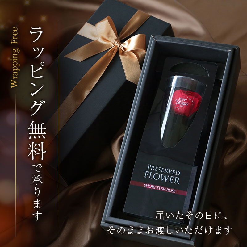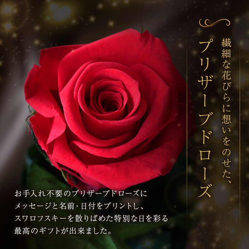 大口注文・法人のお問い合わせはこちらお祝いの定番である真っ赤な薔薇のプリザーブドフラワーに、記念に残るメッセージと日付、特別感のある名入れプリントを施しました。一輪の赤いバラ は「花の女王」とも呼ばれ、愛と美の象徴となっています。愛の告白や、お祝いのシーンでは欠かせない立役者です。