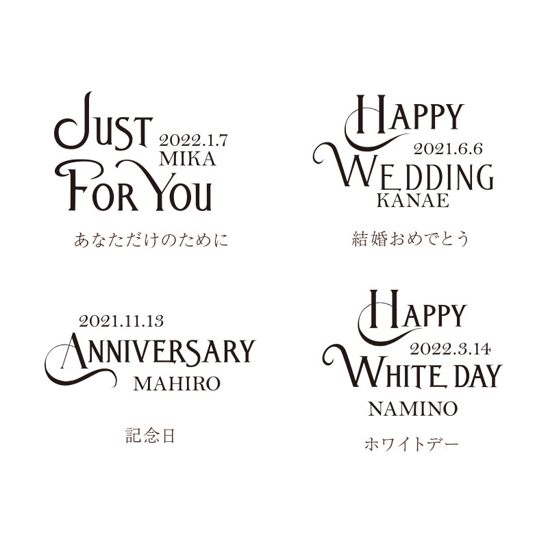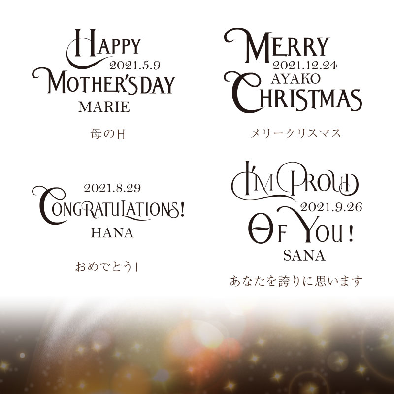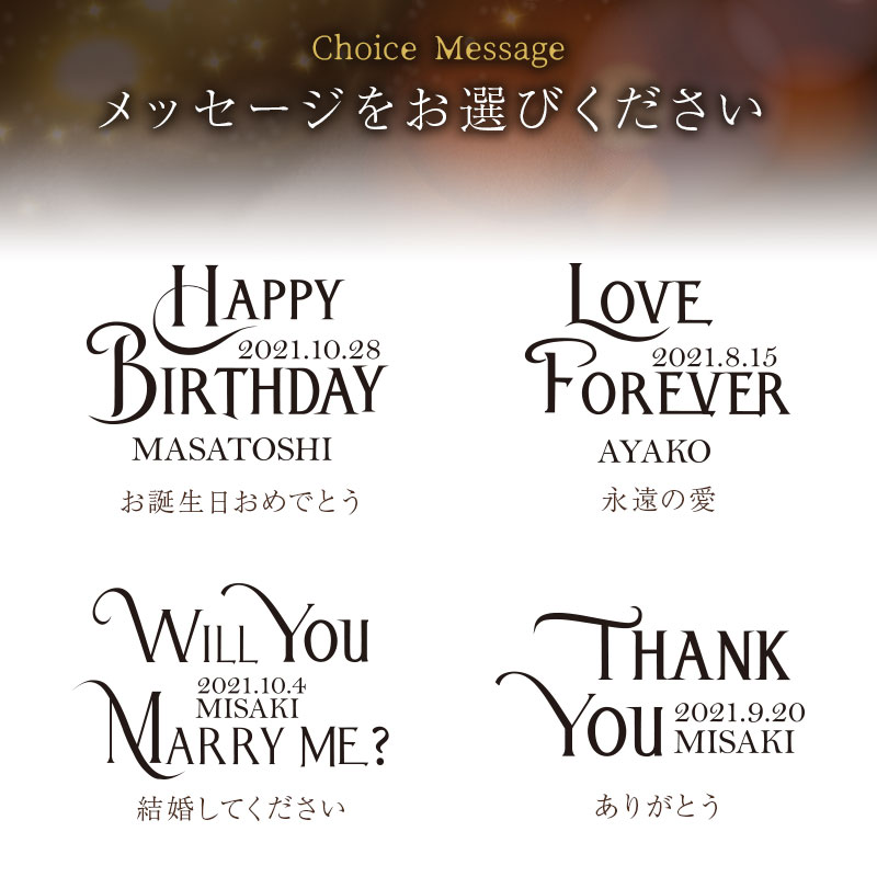 | 対応可能オプション | 【無料オプション】 ・紙袋 ・名前入れ(ローマ字のみ) ・メッセージ メッセージ(12種選択) Happy Birthday Love Forever Will you marry me? Thank You Just For You Happy Wedding Anniversary Happy White Day Happy Mother’s Day Merry Christmas Congratulations! I’m proud of you! ・日付(例:2020.5.10) ・スワロフスキーの色(12種選択) なし(クリスタルも付きません) 1月ガーネットカラー 2月アメジストカラー 3月アクアマリンカラー 4月ダイアモンドカラー 5月エメラルドカラー 6月パールカラー 7月ルビーカラー 8月ペリドットカラー 9月サファイアカラー 10月トルマリンカラー 11月シトリンカラー 12月タンザナイトカラー |