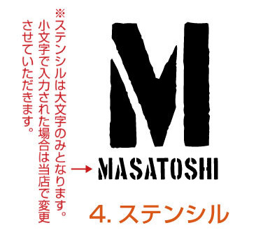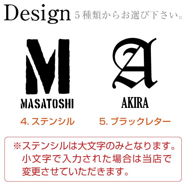 それぞれのイニシャルデザインに合わせたフォントで、 イニシャルの下にはお名前が入ります。 当店専属デザイナーによる完全オリジナルのイニシャルデザインなら、年齢や性別を問わずお使いいただけ日常に溶け込みます。
