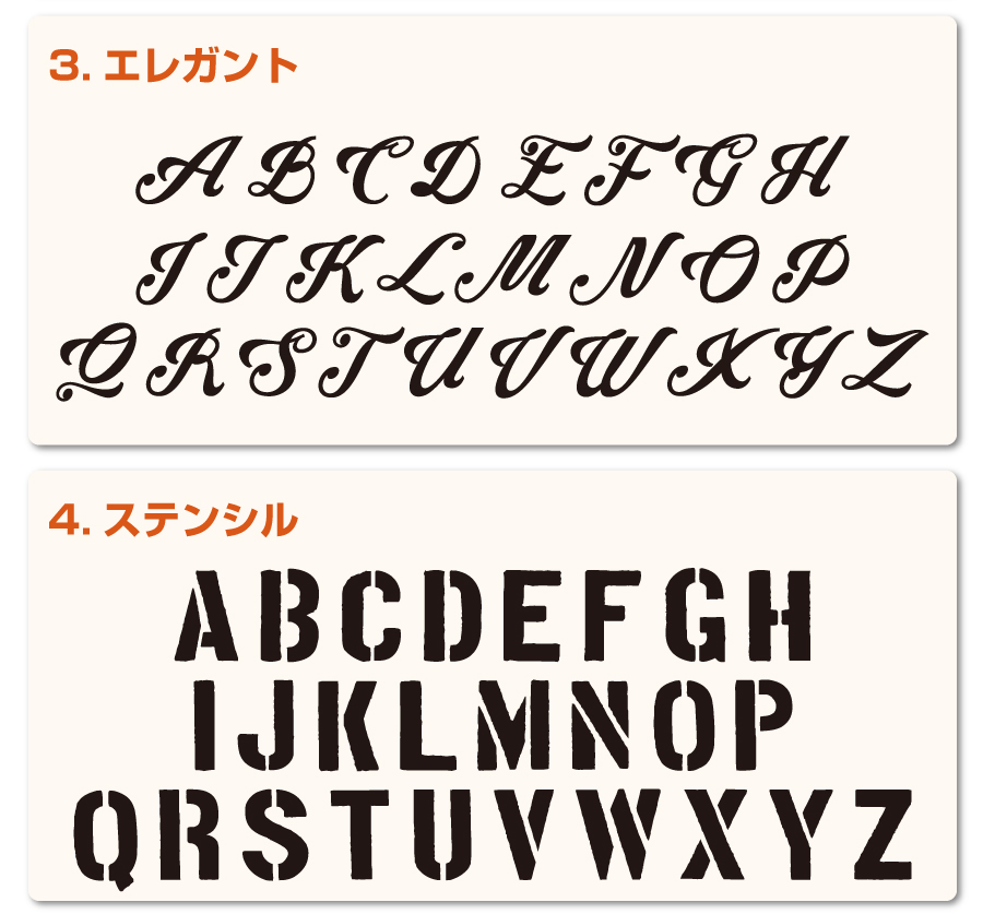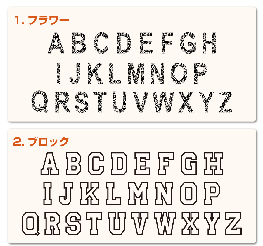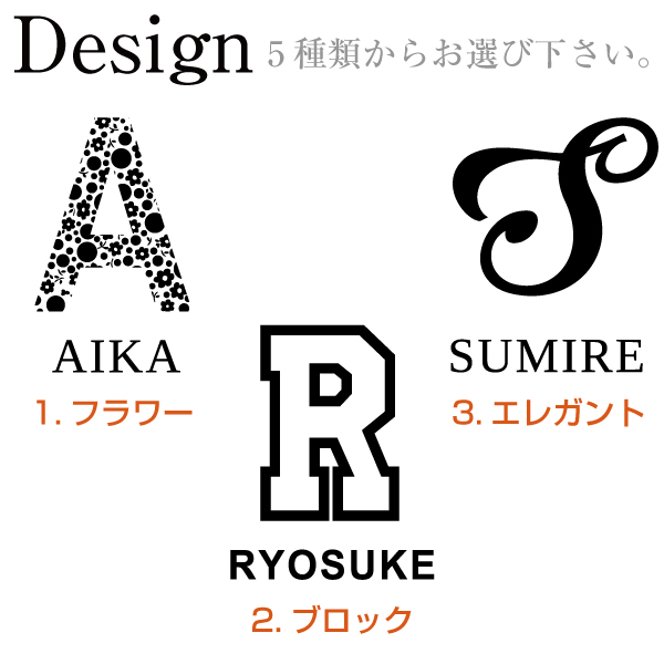 | 対応可能オプション | 【無料オプション】 ・不織布袋 ・名前入れ(ローマ字10文字) ・デザイン(5種選択) 1.フラワー 2.ブロック 3.エレガント 4.ステンシル 5.ブラックレター ・イニシャル(26種選択) |
