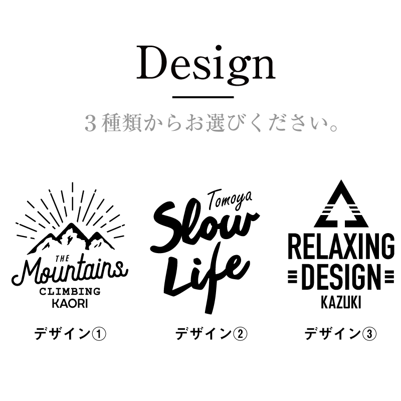 ・マウンテン(THE Mountains CLIMBING ) アウトドア好きにぴったりな山デザインです。男性にはもちろん、山登りが好きな女性にもおすすめです。 ・スローライフ(Slow Life) スローライフを送ってほしいあの人に。見るたびにゆったりとした気持ちになれる印象的なフォントデザインが魅力です。 ・リラックス(RELAXING DESIGN) 使うたびにテンションが上がるような男らしいデザインです。