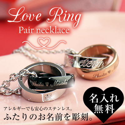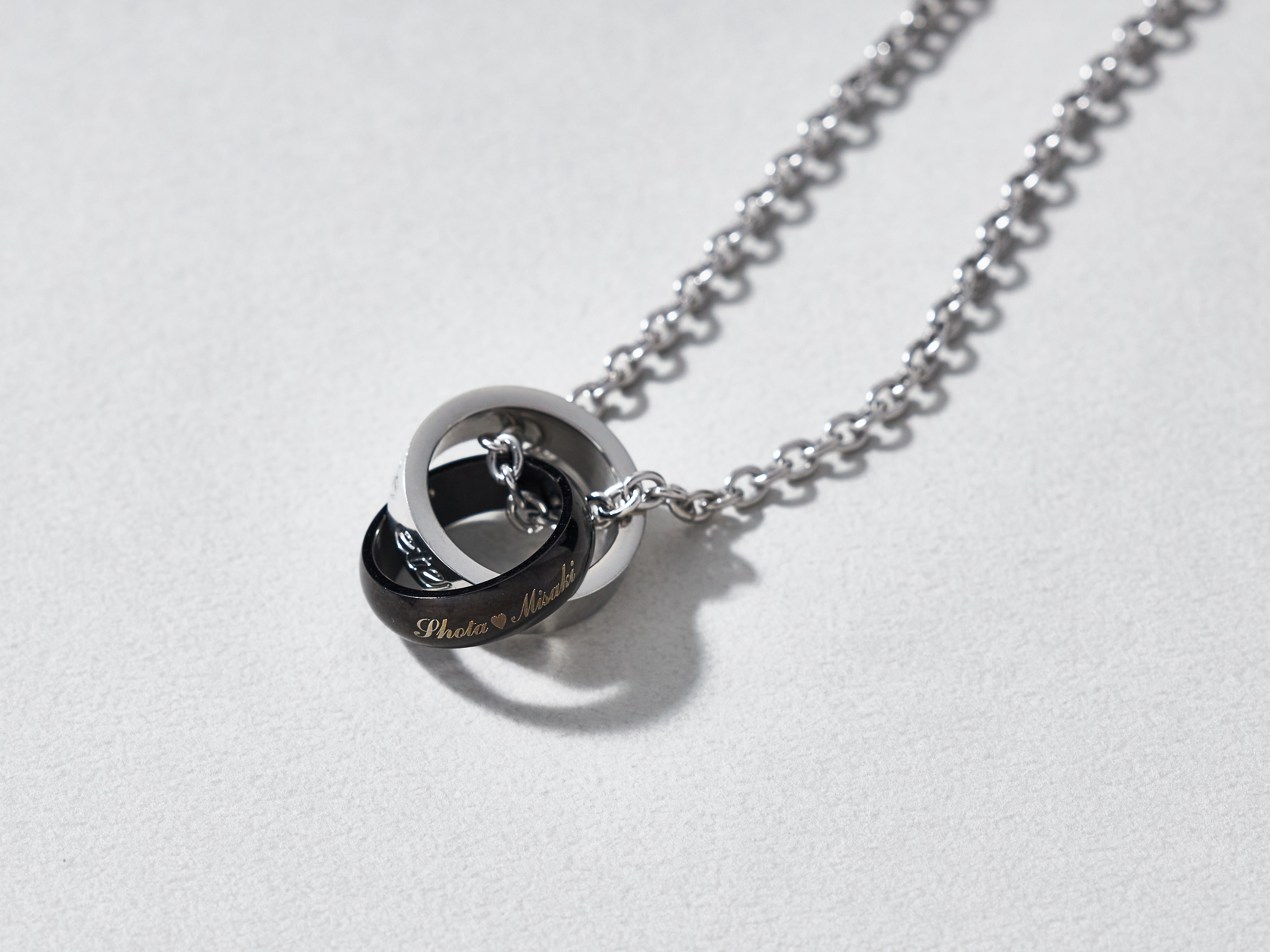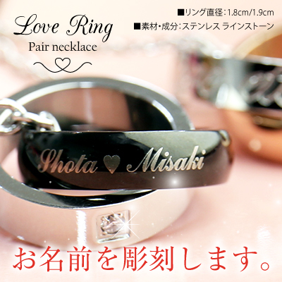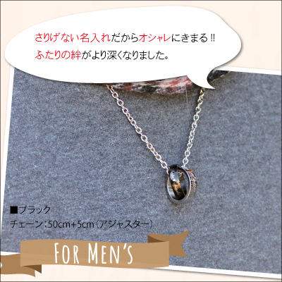 大口注文・法人のお問い合わせはこちらさりげないお名前彫刻デザインで、ふたりの絆がより一層深くなるペアネックレス。 リングにチェーンを通したデザインは、飽きが来ないので二人で長く愛用いただけます。 ピンクゴールドとブラックの2カラーがあるのでペアで着用することができます。 素材は金属アレルギーの方や変色にも心配の少ないステンレスを使用しています。